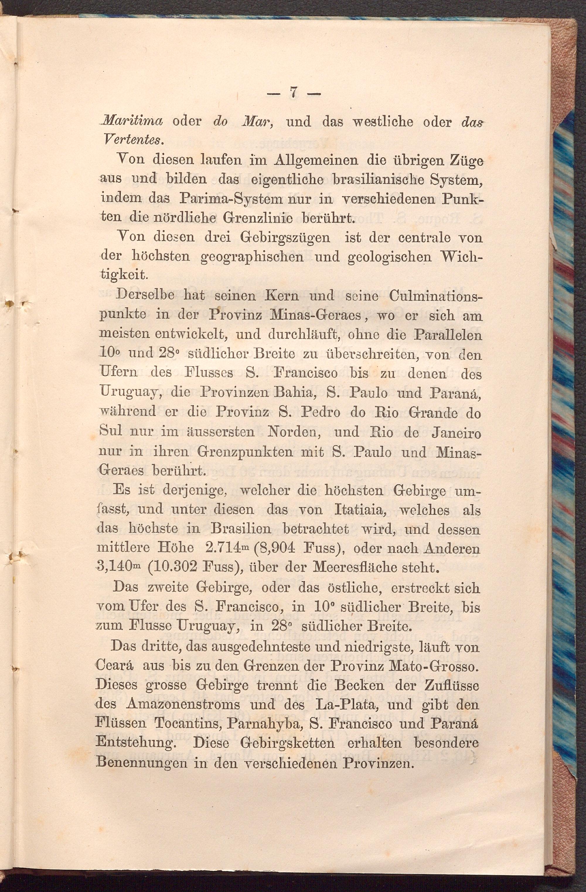 Das dritte, das ausgedehnteste und niedrigste, läuft von Ceará aus bis zu den Grenzen der Provinz Mato- Grosso. Dieses grosse Gebirge trennt die Becken der Zuflüsse des Amazonenstroms und des La- Plata, und gibt den Flüssen Tocantins, Parnahyba, S. Francisco und Paraná Entstehung. Diese Gebirgsketten erhalten besondere Benennungen in den verschiedenen Provinzen.