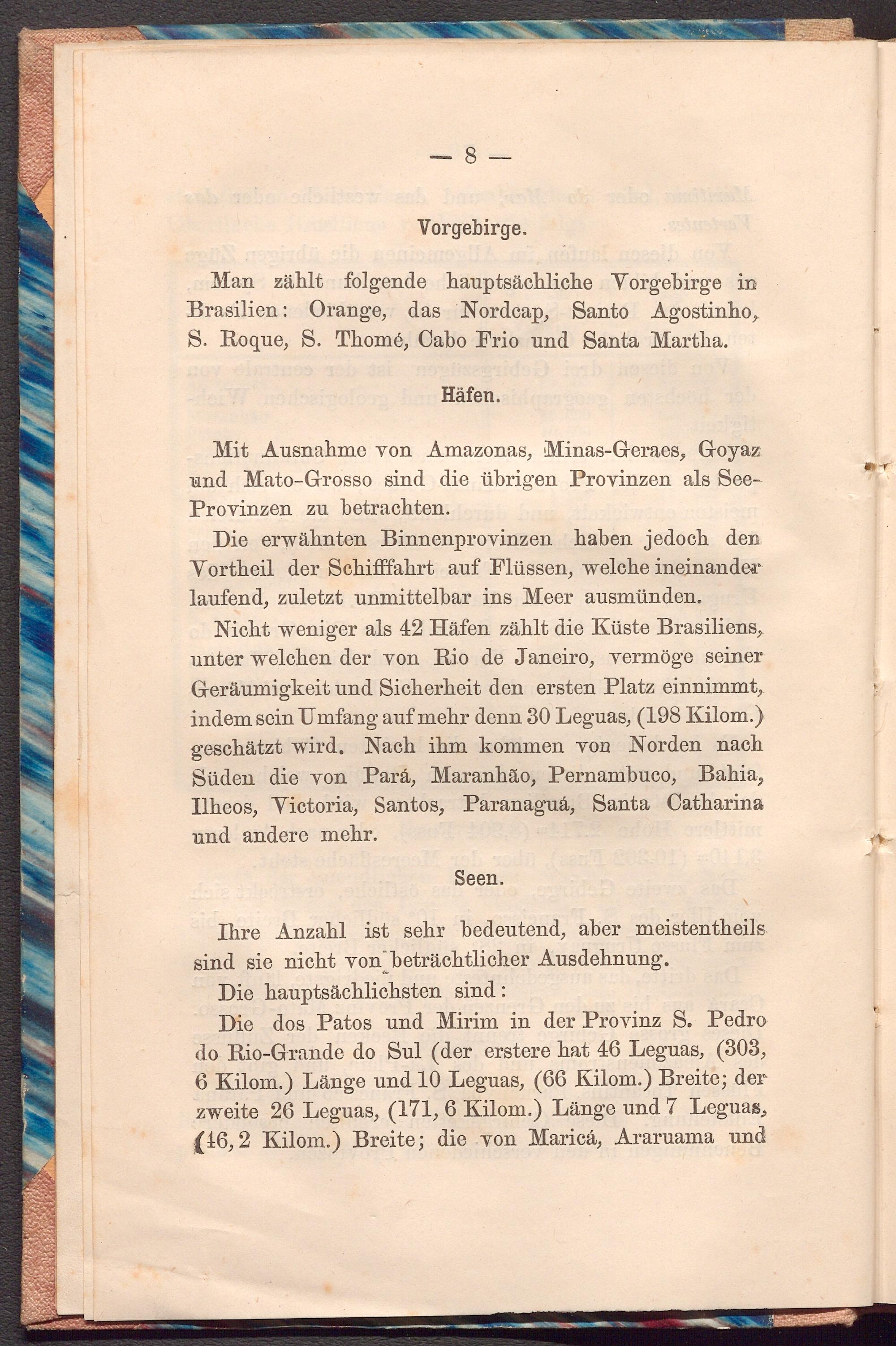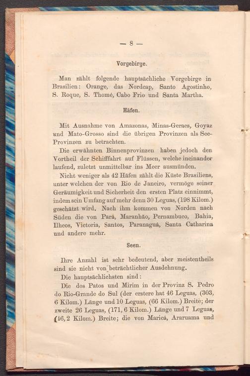 Nicht weniger als 42 Häfen zählt die Küste Brasiliens, unter welchen der von Rio de Janeiro, vermöge seiner Geräumigkeit und Sicherheit den ersten Platz einnimmt, indem sein Umfang auf mehr denn 30 Leguas,( 198 Kilom.) geschätzt wird. Nach ihm kommen von Norden nach Süden die von Pará, Maranhão, Pernambuco, Bahia, Ilheos, Victoria, Santos, Paranaguá, Santa Catharina und andere mehr.