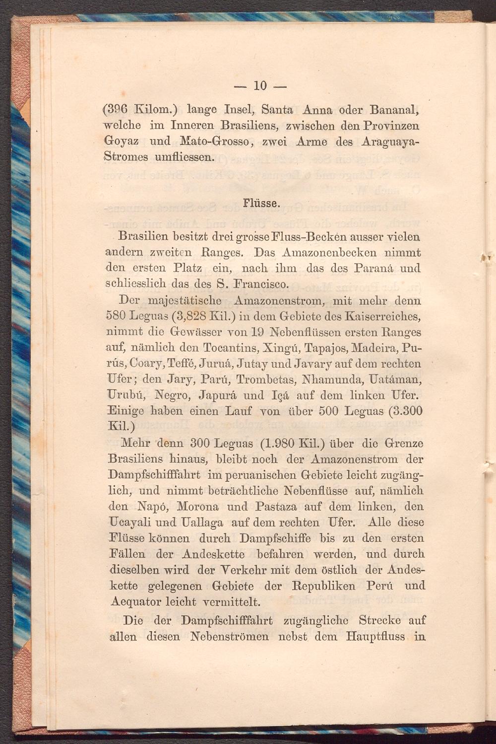 Der majestätische Amazonenstrom, mit mehr denn 580 Leguas( 3,828 Kil.) in dem Gebiete des Kaiserreiches, nimmt die Gewässer von 19 Nebenflüssen ersten Ranges auf, nämlich den Tocantins, Xingú, Tapajos, Madeira, Purús, Coary, Teffé, Juruá, Jutay und Javary auf dem rechten Ufer; den Jary, Parú, Trombetas, Nhamunda, Uatáman, Urubú, Negro, Japurá und Içá auf dem linken Ufer. Einige haben einen Lauf von über 500 Leguas( 3.300 Kil.)