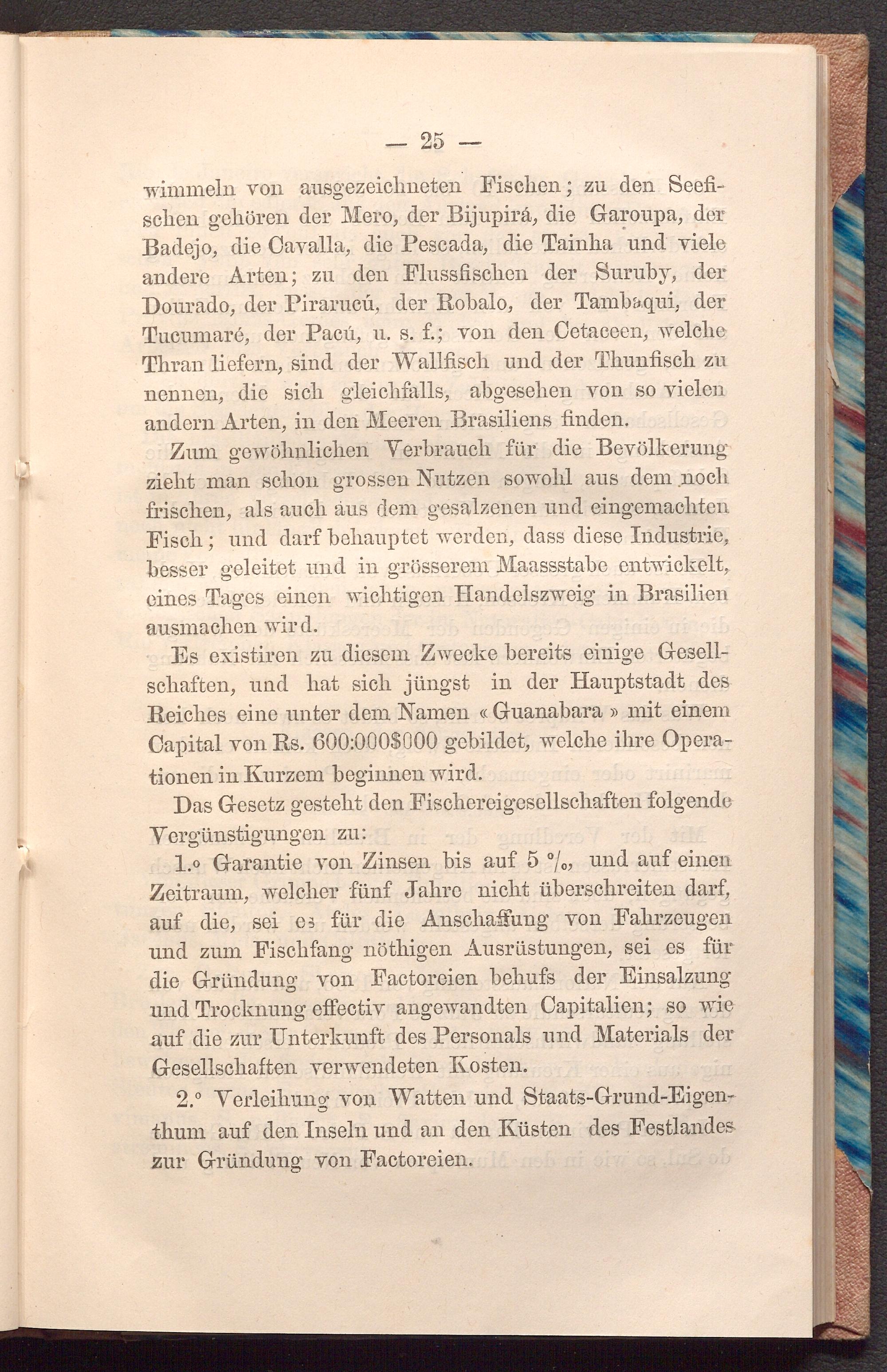 Das Gesetz gesteht den Fischereigesellschaften folgende Vergünstigungen zu: do 1.0 Garantie von Zinsen bis auf 5%, und auf einen Zeitraum, welcher fünf Jahre nicht überschreiten darf, auf die, sei es für die Anschaffung von Fahrzeugen und zum Fischfang nöthigen Ausrüstungen, sei es für die Gründung von Factoreien behufs der Einsalzung und Trocknung effectiv angewandten Capitalien; so wie auf die zur Unterkunft des Personals und Materials der Gesellschaften verwendeten Kosten. gin
