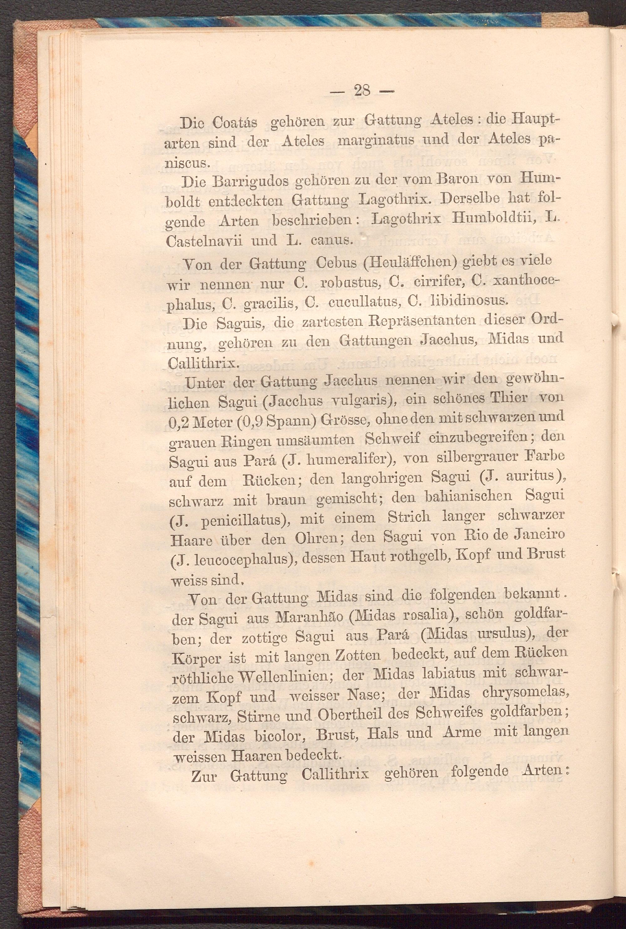 Die Saguis, die zartesten Repräsentanten dieser Ordnung, gehören zu den Gattungen Jacchus, Midas und Callithrix. bai dailgatla I doin doom Unter der Gattung Jacchus nennen wir den gewöhnlichen Sagui( Jacchus vulgaris), ein schönes Thier von 0,2 Meter( 0,9 Spann) Grösse, ohne den mit schwarzen und grauen Ringen umsäumten Schweif einzubegreifen; den Sagui aus Pará( J. humeralifer), von silbergrauer Farbe auf dem Rücken; den langohrigen Sagui( J. auritus), schwarz mit braun gemischt; den bahianischen Sagui ( J. penicillatus), mit einem Strich langer schwarzer Haare über den Ohren; den Sagui von Rio de Janeiro ( J. leucocephalus), dessen Haut rothgelb, Kopf und Brust weiss sind,