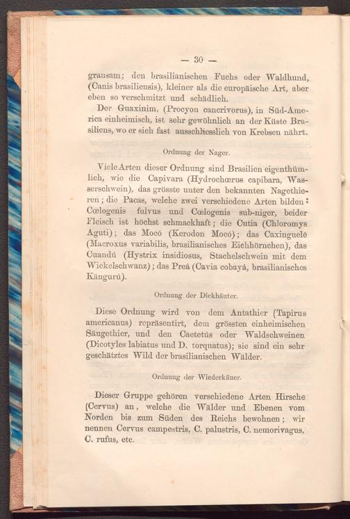 Viele Arten dieser Ordnung sind Brasilien eigenthümlich, wie die Capivara( Hydrochoerus capibara, Wasserschwein), das grösste unter den bekannten Nagethieren; die Pacas, welche zwei verschiedene Arten bilden: Coelogenis fulvus und Coelogenis sub- niger, beider Fleisch ist höchst schmackhaft; die Cutia( Chloromys Aguti); das Mocó( Kerodon Mocó); das Caxinguelê ( Macroxus variabilis, brasilianisches Eichhörnchen), das Cuandú( Hystrix insidiosus, Stachelschwein mit dem Wickelschwanz); das Preá( Cavia cobayá, brasilianisches Kängurú).
