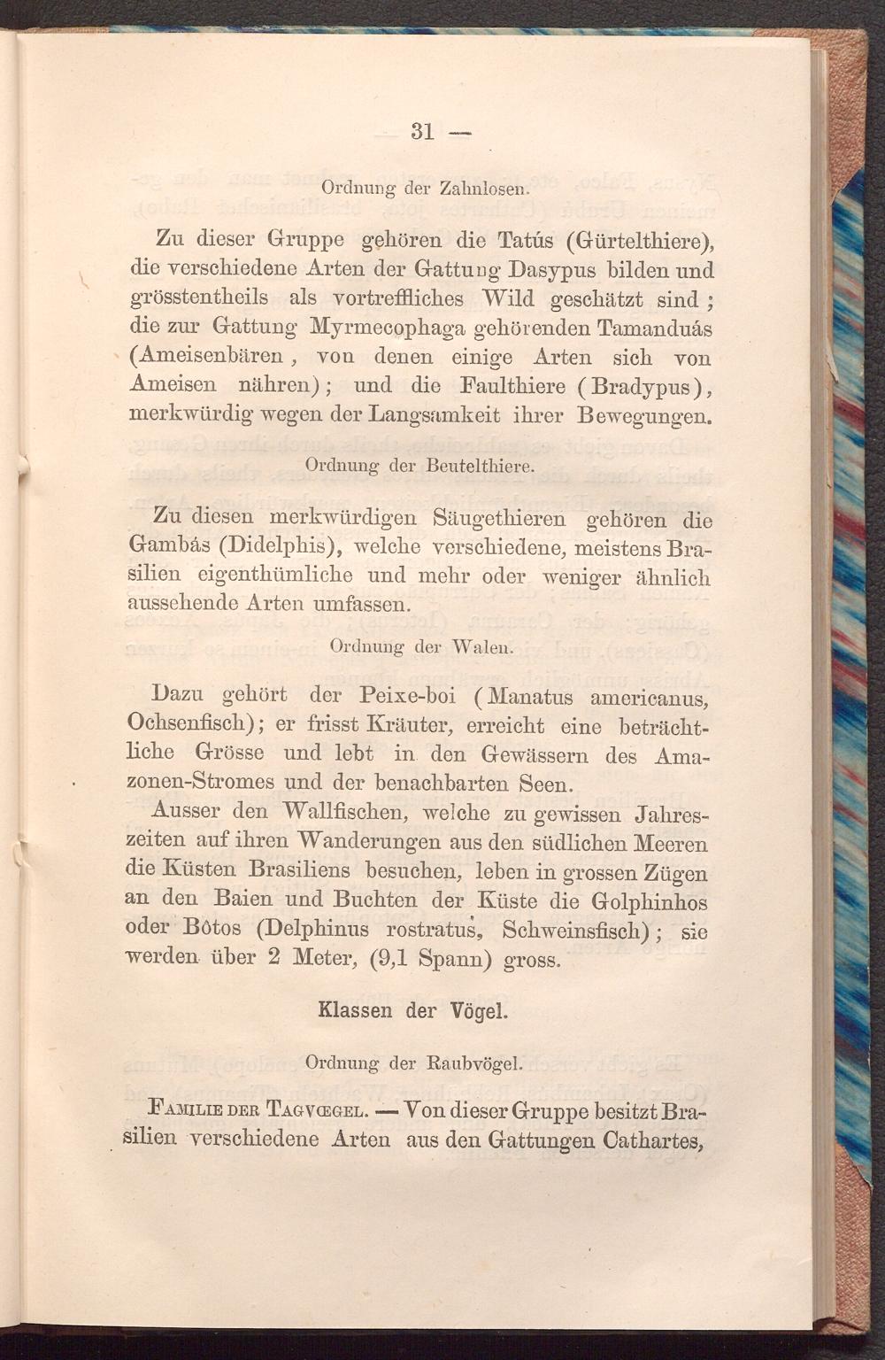 Ausser den Wallfischen, welche zu gewissen Jahreszeiten auf ihren Wanderungen aus den südlichen Meeren die Küsten Brasiliens besuchen, leben in grossen Zügen an den Baien und Buchten der Küste die Golphinhos oder Botos( Delphinus rostratus, Schweinsfisch); sie werden über 2 Meter,( 9,1 Spann) gross.