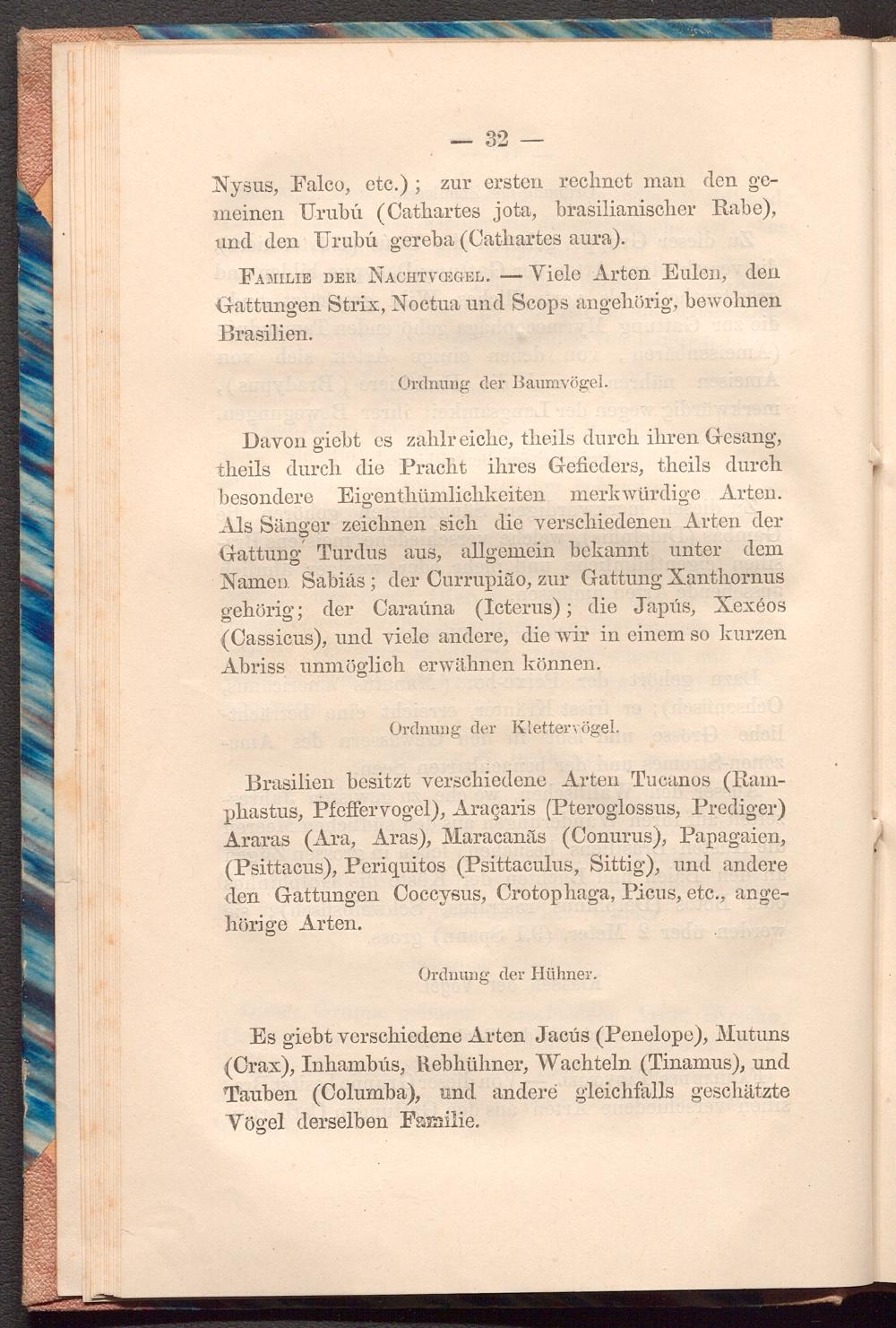 Davon giebt es zahlreiche, theils durch ihren Gesang, theils durch die Pracht ihres Gefieders, theils durch besondere Eigenthümlichkeiten merkwürdige Arten. Als Sänger zeichnen sich die verschiedenen Arten der Gattung Turdus aus, allgemein bekannt unter dem Namen Sabiás; der Currupião, zur Gattung Xanthornus gehörig; der Caraúna( Icterus); die Japús, Xexéos ( Cassicus), und viele andere, die wir in einem so kurzen Abriss unmöglich erwähnen können.