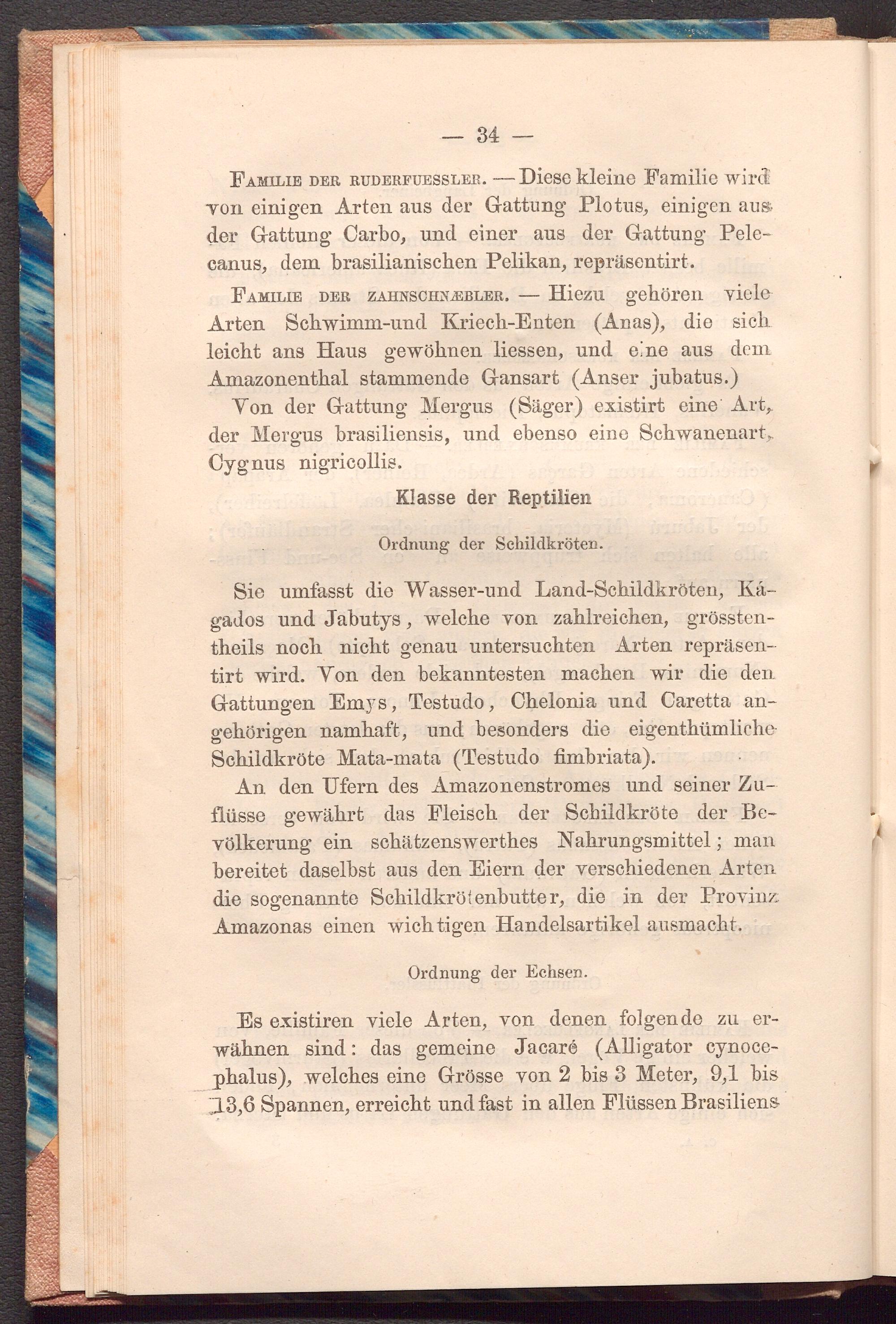 Sie umfasst die Wasser- und Land- Schildkröten, Kágados und Jabutys, welche von zahlreichen, grösstentheils noch nicht genau untersuchten Arten repräsentirt wird. Von den bekanntesten machen wir die den Gattungen Emys, Testudo, Chelonia und Caretta angehörigen namhaft, und besonders die eigenthümliche Schildkröte Mata- mata( Testudo fimbriata).