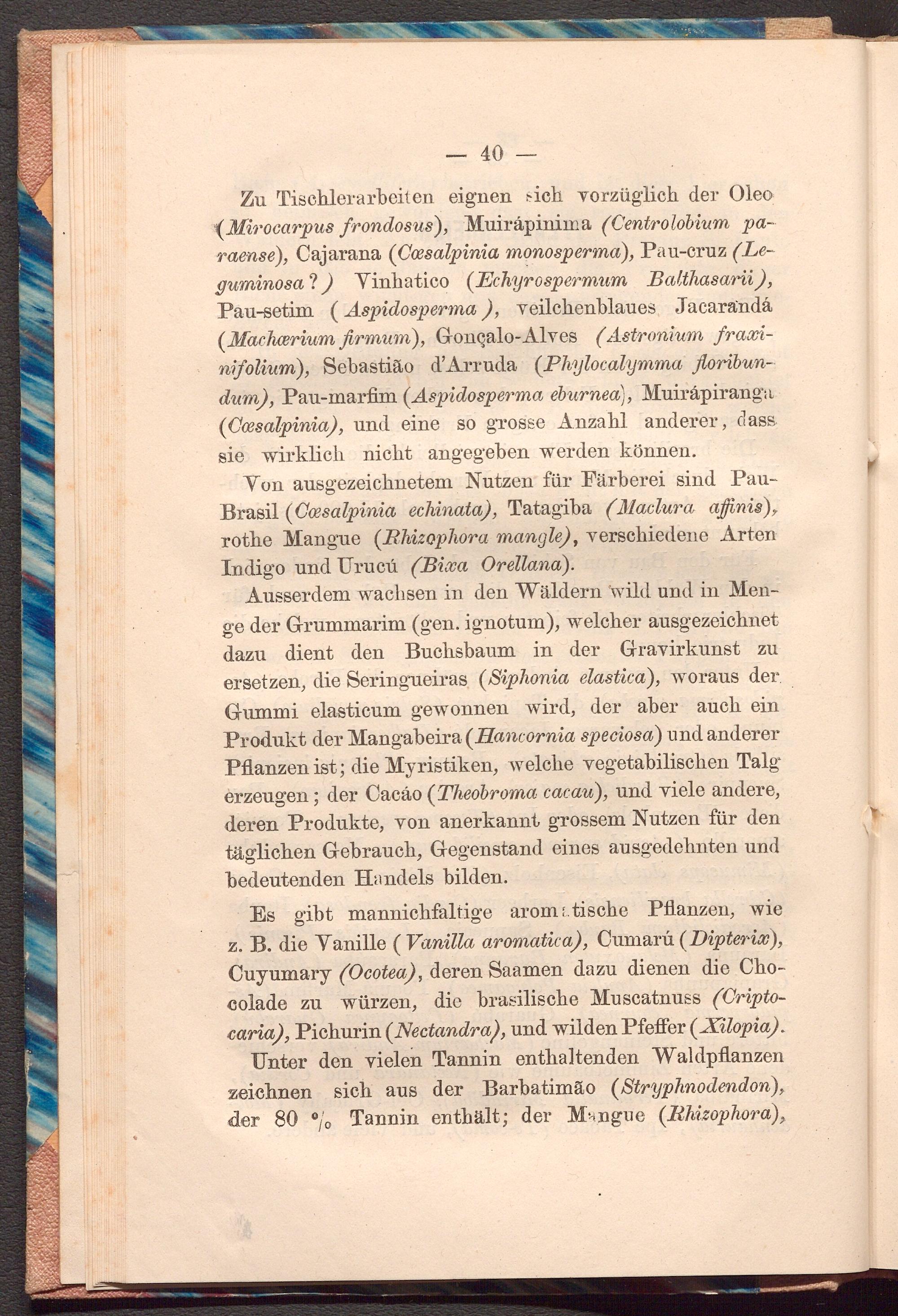 Zu Tischlerarbeiten eignen sich vorzüglich der Oleo ( Mirocarpus frondosus), Muirápinima( Centrolobium paraense), Cajarana( Caesalpinia monosperma), Pau- cruz( Leguminosa?) Vinhatico( Echyrospermum Balthasarii), Pau- setim( Aspidosperma), veilchenblaues Jacarandá ( Macharium firmum), Gonçalo- Alves( Astronium fraxinifolium), Sebastião d'Arruda( Phylocalymma floribundum), Pau- marfim( Aspidosperma eburnea), Muirápiranga ( Caesalpinia), und eine so grosse Anzahl anderer, dass sie wirklich nicht angegeben werden können.