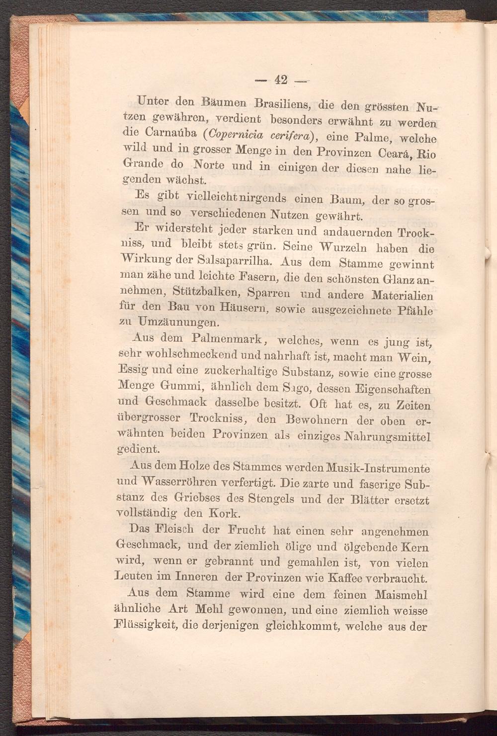 Unter den Bäumen Brasiliens, die den grössten Nutzen gewähren, verdient besonders erwähnt zu werden die Carnaúba( Copernicia cerifera), eine Palme, welche wild und in grosser Menge in den Provinzen Ceará, Rio Grande do Norte und in einigen der diesen nahe liegenden wächst.