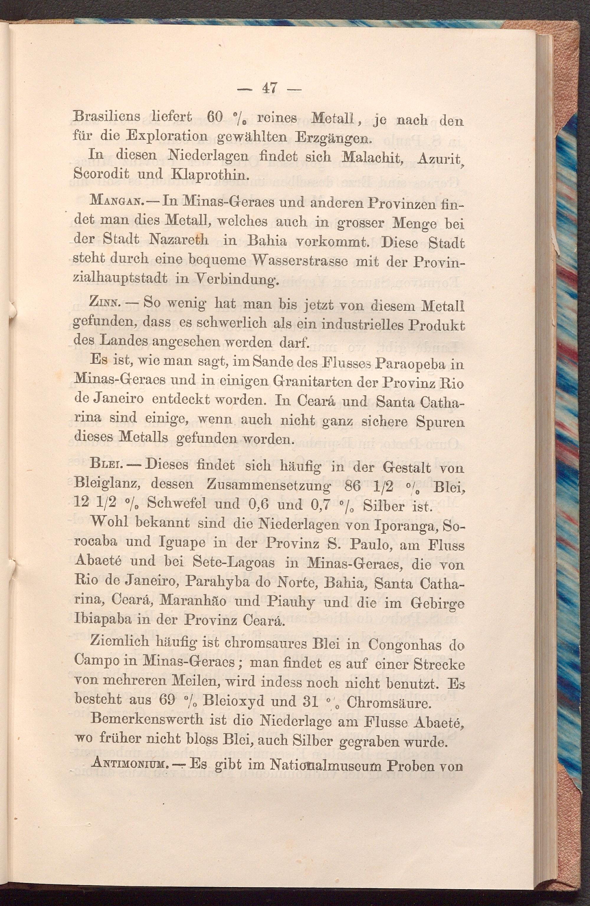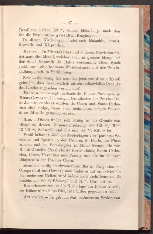 Bemerkenswerth ist die Niederlage am Flusse Abaeté, wo früher nicht bloss Blei, auch Silber gegraben wurde. ANTIMONIUM. Es gibt im Nationalmuseum Proben von