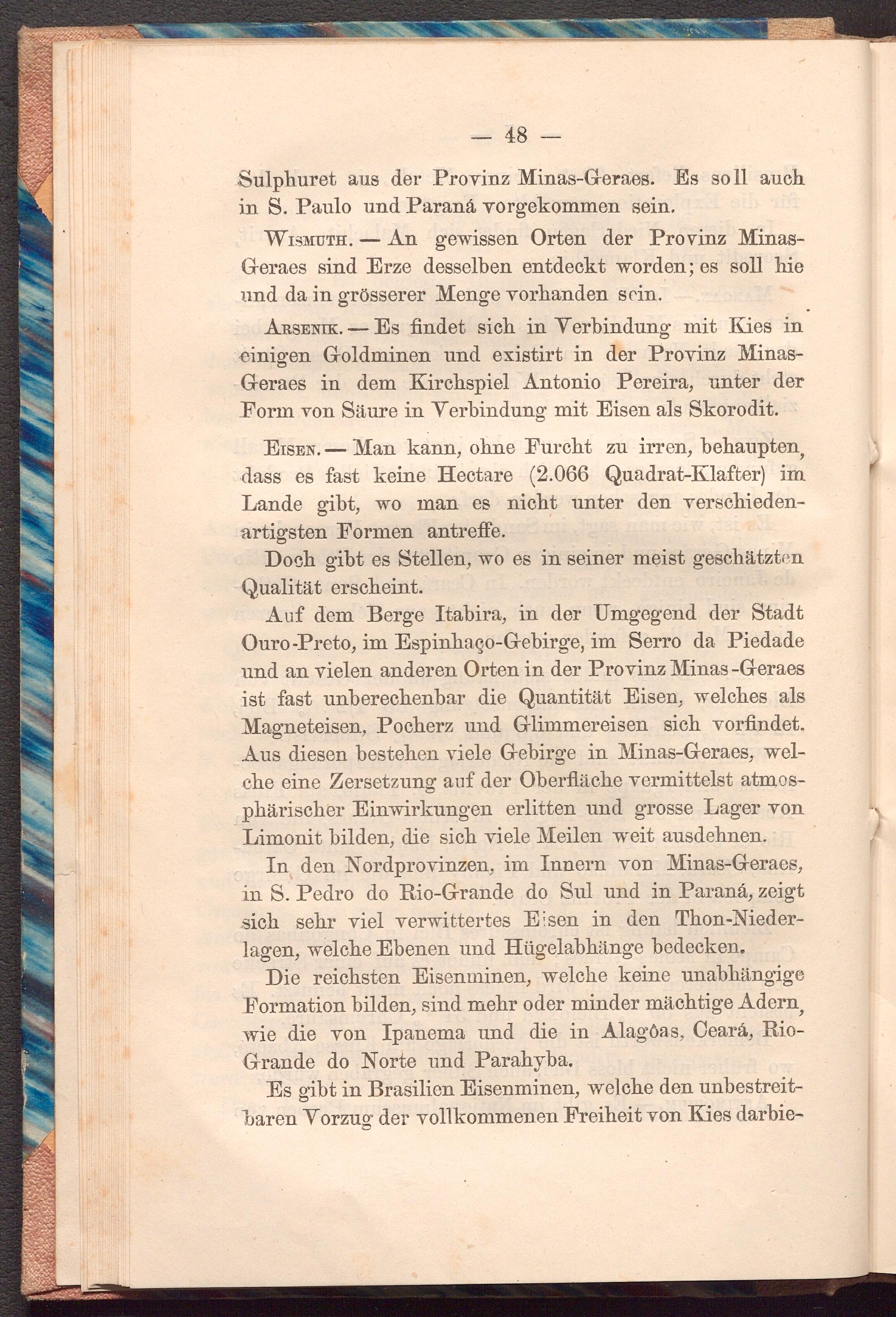 Auf dem Berge Itabira, in der Umgegend der Stadt Ouro- Preto, im Espinhaço- Gebirge, im Serro da Piedade und an vielen anderen Orten in der Provinz Minas- Geraes ist fast unberechenbar die Quantität Eisen, welches als Magneteisen, Pocherz und Glimmereisen sich vorfindet. Aus diesen bestehen viele Gebirge in Minas- Geraes, welche eine Zersetzung auf der Oberfläche vermittelst atmosphärischer Einwirkungen erlitten und grosse Lager von Limonit bilden, die sich viele Meilen weit ausdehnen.