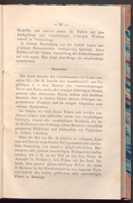 Ohne die Bai von Rio de Janeiro zu verlassen, kann man auf den sie umgebenden Gebirgsmassen eine ansehnliche Sammlung von dunklen porphyrähnlichen Marmorarten mit grossen rosenfarbigen Feldspathkrystallen machen, wie z. B. es der Fall ist mit dem Morro da Armação in Nictheroy, dem Felsen auf der Insel Paquetá, dem grauen glimmerhaltigen Felsen der Serra do Matheus bei der Eisenbahnstation von Engenho Novo, und endlich den hellen, gelblichen oder rosenfarbigen Felsen in Botafogo.