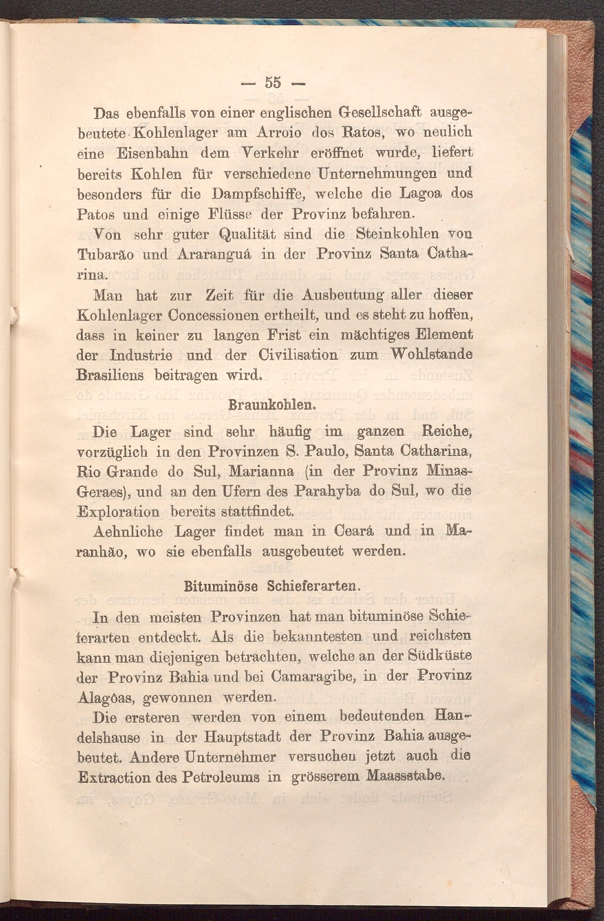 In den meisten Provinzen hat man bituminöse Schieferarten entdeckt. Als die bekanntesten und reichsten kann man diejenigen betrachten, welche an der Südküste der Provinz Bahia und bei Camaragibe, in der Provinz Alagoas, gewonnen werden.