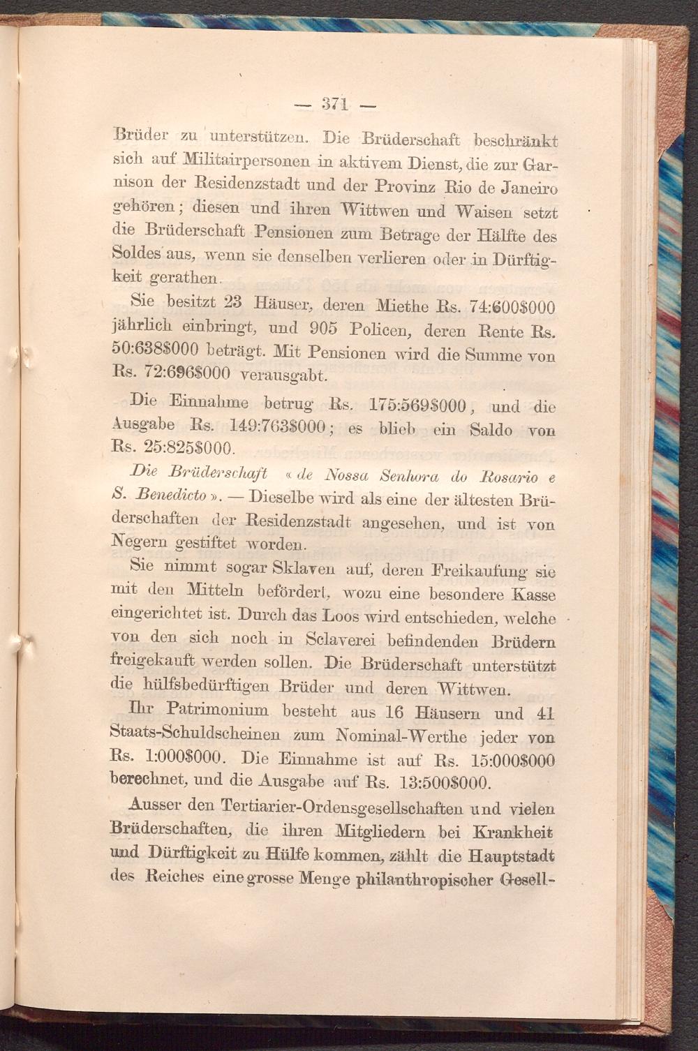 Brüder zu unterstützen. Die Brüderschaft beschränkt sich auf Militairpersonen in aktivem Dienst, die zur Garnison der Residenzstadt und der Provinz Rio de Janeiro gehören; diesen und ihren Wittwen und Waisen setzt die Brüderschaft Pensionen zum Betrage der Hälfte des Soldes aus, wenn sie denselben verlieren oder in Dürftigkeit gerathen.