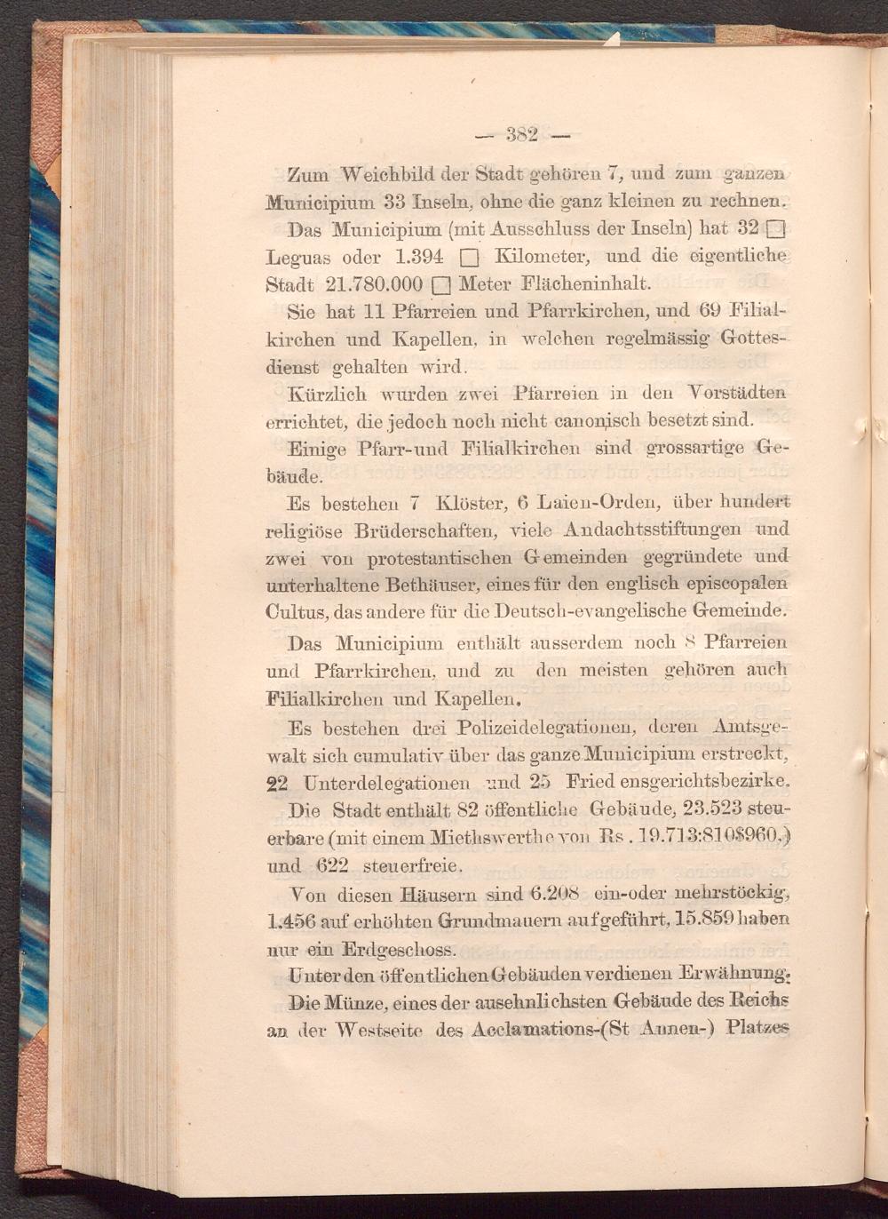 Zum Weichbild der Stadt gehören 7, und zum ganzen Municipium 33 Inseln, ohne die ganz kleinen zu rechnen. Das Municipium( mit Ausschluss der Inseln) hat 32 Leguas oder 1.394 Kilometer, und die eigentliche Stadt 21.780.000 Meter Flächeninhalt.