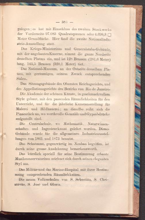 Das Sitzungsgebäude des Obersten Reichsgerichts, und des Appellationsgerichts des Bezirks von Rio de Janeiro. Die Akademie der schönen Künste, in geschmackvollem Style gebaut, mit den passenden Räumlichkeiten für den Unterricht, und für die jährliche Kunstausstellung für Malerei und Bildhauerei; an dieselbe reiht sich die Pinacothek an, wo werthvolle Gemälde und Gypsabdrücke aufgestellt sind.