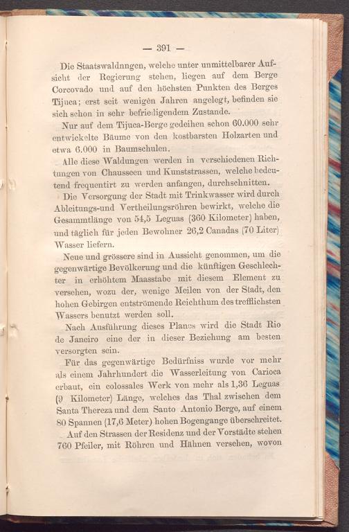 Für das gegenwärtige Bedürfniss wurde vor mehr als einem Jahrhundert die Wasserleitung von Carioca erbaut, ein colossales Werk von mehr als 1,36 Leguas ( 9 Kilometer) Länge, welches das Thal zwischen dem Santa Thereza und dem Santo Antonio Berge, auf einem 80 Spannen( 17,6 Meter) hohen Bogengange überschreitet.