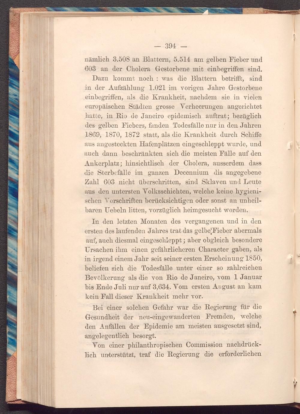 Dazu kommt noch was die Blattern betrifft, sind in der Aufzählung 1.021 im vorigen Jahre Gestorbene einbegriffen, als die Krankheit, nachdem sie in vielen europäischen Städten grosse Verheerungen angerichtet hatte, in Rio de Janeiro epidemisch auftrat; bezüglich des gelben Fiebers, fanden Todesfälle nur in den Jahren 1869, 1870, 1872 statt, als die Krankheit durch Schiffe aus angesteckten Hafenplätzen eingeschleppt wurde, und auch dann beschränkten sich die meisten Fälle auf den Ankerplatz; hinsichtlisch der Cholera, ausserdem dass die Sterbefälle im ganzen Decennium dis angegebene Zahl 603 nicht überschritten, sind Sklaven und Leute aus den untersten Volksschichten, welche keine hygienischen Vorschriften berücksichtigen oder sonst an unheilbaren Uebeln litten, vorzüglich heimgesucht worden.