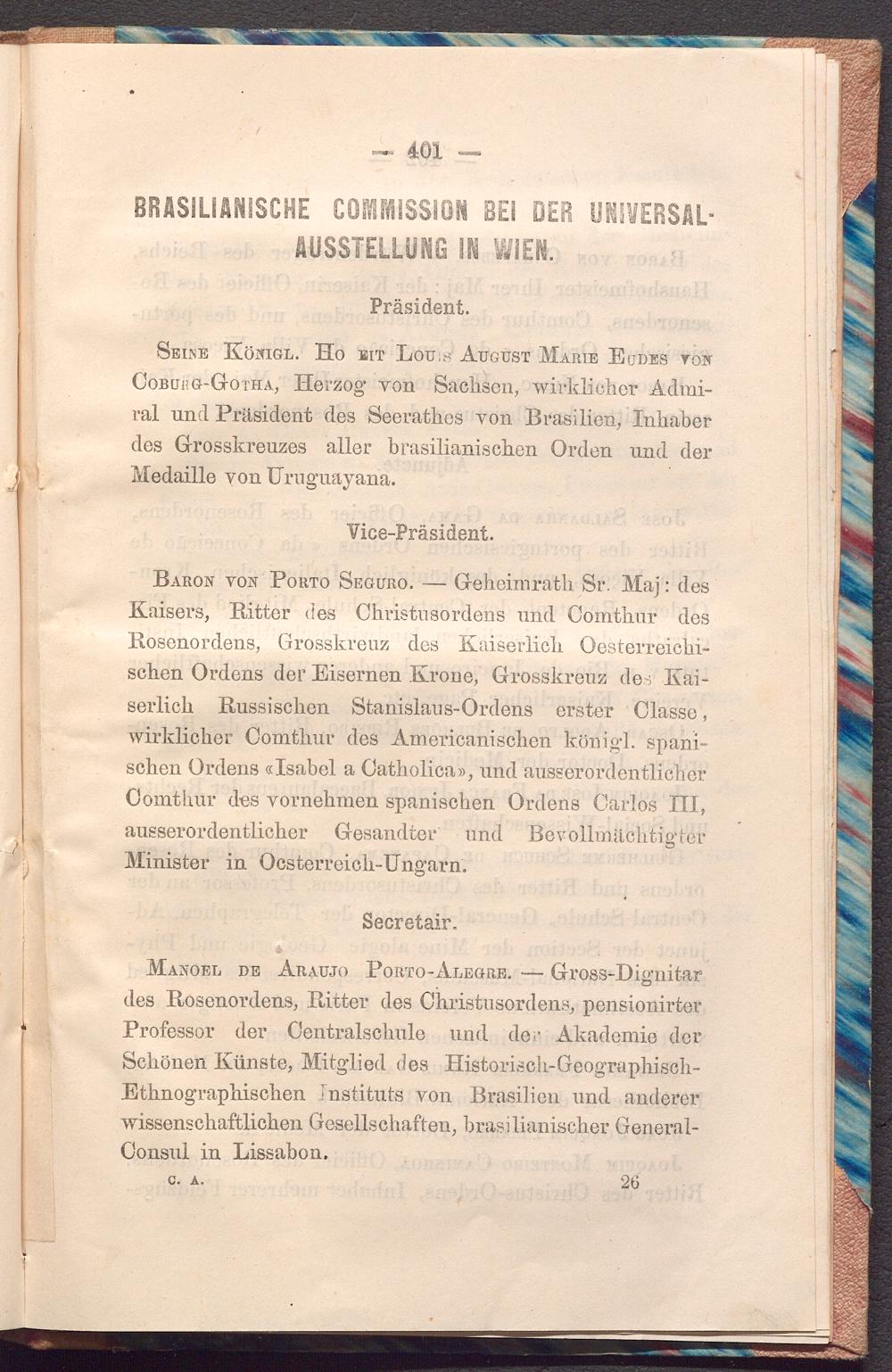BARON VON PORTO SEGURO.Geheimrath Sr. Maj: des Kaisers, Ritter des Christusordens und Comthur des Rosenordens, Grosskreuz des Kaiserlich Oesterreichischen Ordens der Eisernen Krone, Grosskreuz des Kaiserlich Russischen Stanislaus- Ordens erster Classe, wirklicher Comthur des Americanischen königl. spanischen Ordens« Isabel a Catholica», und ausserordentlicher Comthur des vornehmen spanischen Ordens Carlos III, ausserordentlicher Gesandter und Bevollmächtigter Minister in Oesterreich- Ungarn.
