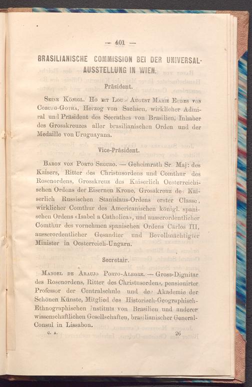 MANOEL DE ARAUJO PORTO- ALEGRE. Gross- Dignitar des Rosenordens, Ritter des Christusordens, pensionirter Professor der Centralschule und der Akademie der Schönen Künste, Mitglied des Historisch- GeographischEthnographischen Instituts von Brasilien und anderer wissenschaftlichen Gesellschaften, brasilianischer GeneralConsul in Lissabon.