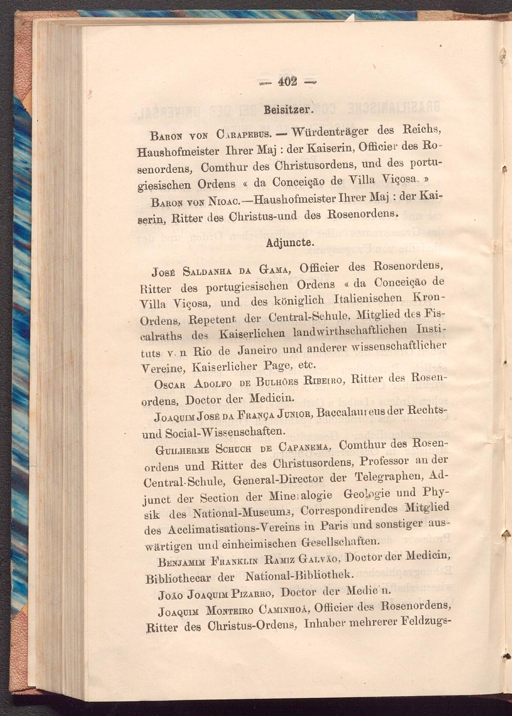 GUILHERME SCHUCH DE CAPANEMA, Comthur des Rosenordens und Ritter des Christusordens, Professor an der Central- Schule, General- Director der Telegraphen, Adjunct der Section der Mine alogie Geologie und Physik des National- Museum3, Correspondirendes Mitglied des Acclimatisations- Vereins in Paris und sonstiger auswärtigen und einheimischen Gesellschaften.