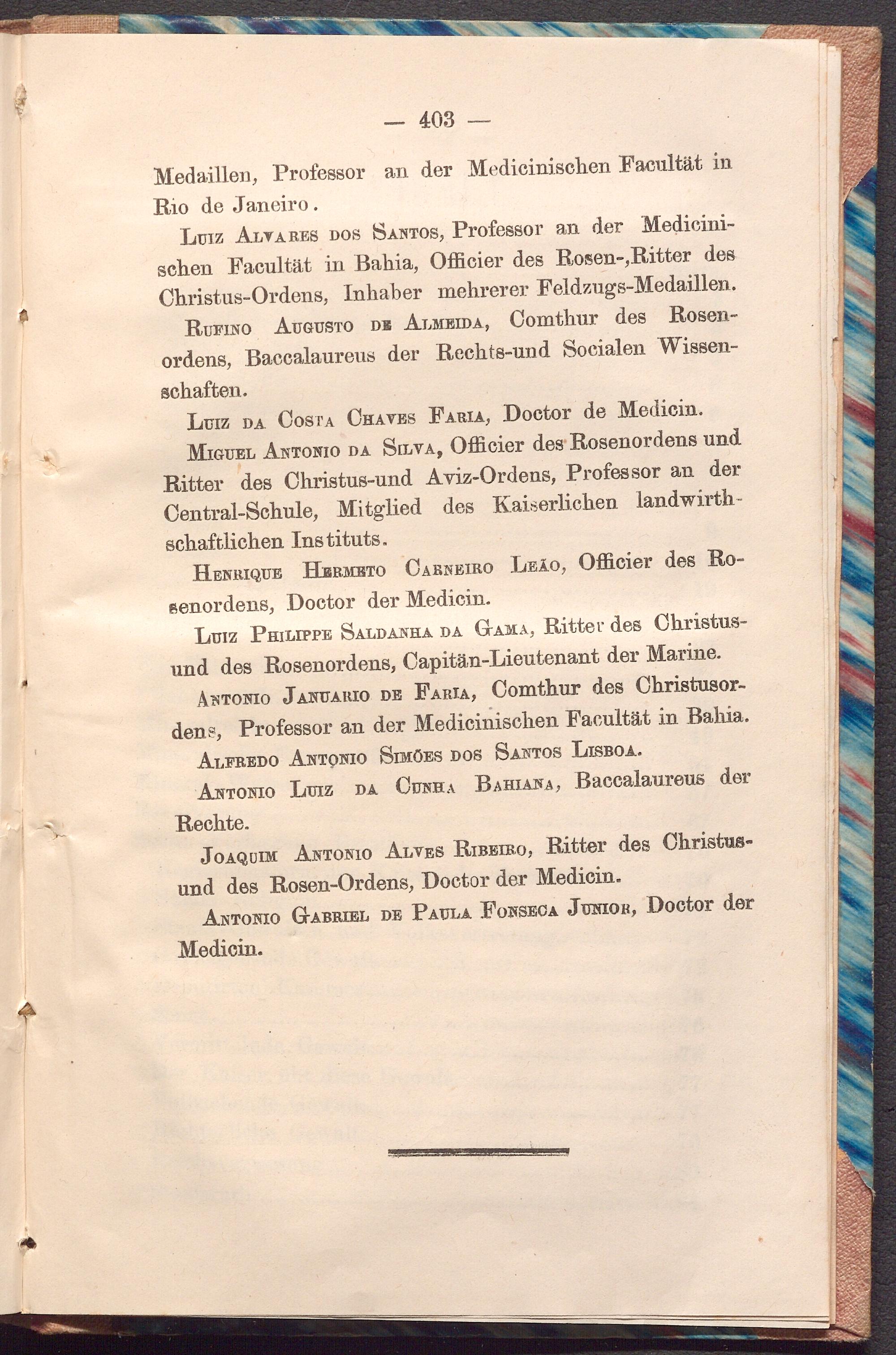 LUIZ PHILIPPE SALDANHA DA GAMA, Ritter des Christusund des Rosenordens, Capitän- Lieutenant der Marine. ANTONIO JANUARIO DE FARIA, Comthur des Christusordens, Professor an der Medicinischen Facultät in Bahia. ALFREDO ANTONIO SIMÕES DOS SANTOS LISBOA.