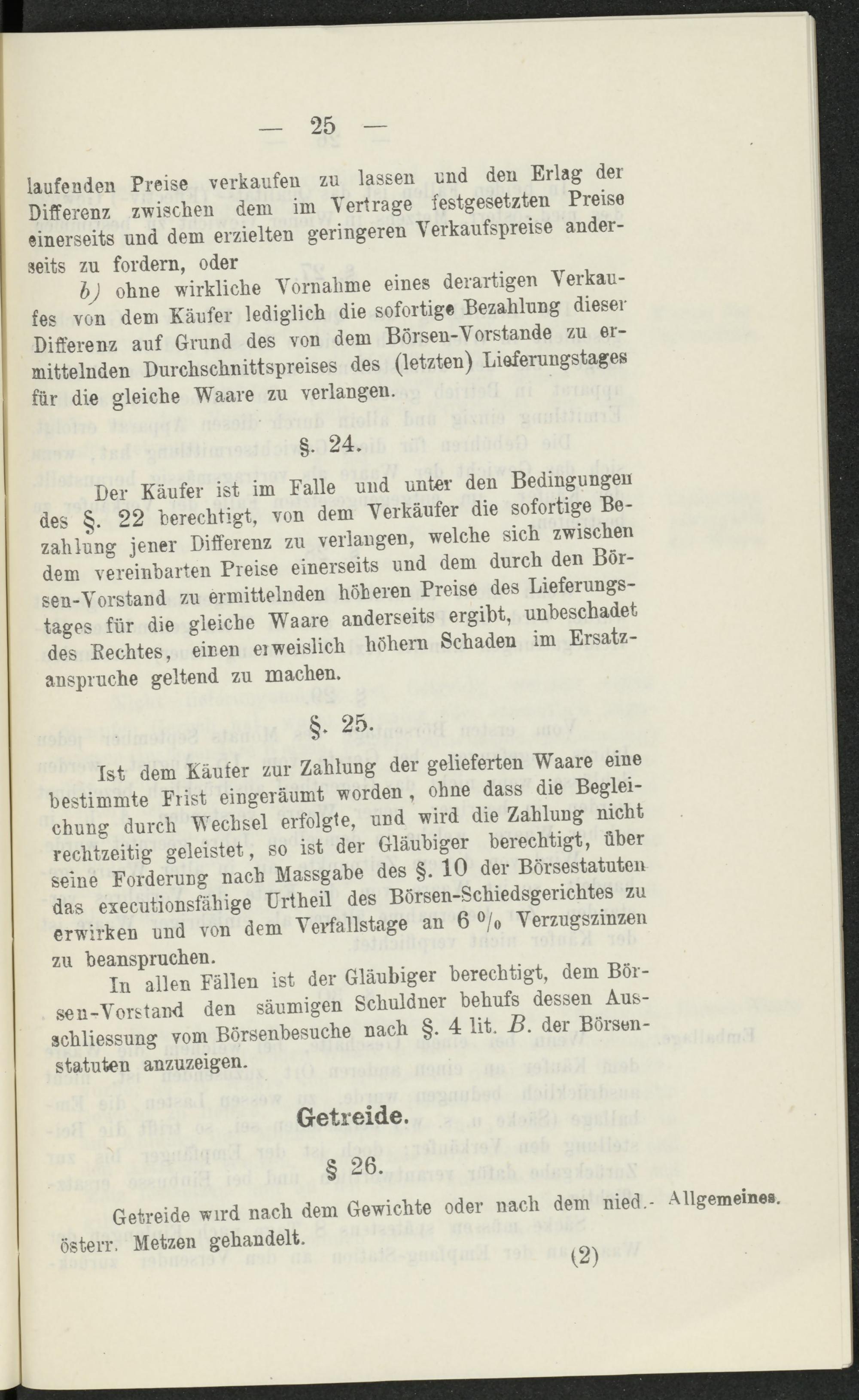 Der Käufer ist im Falle und unter den Bedingungen des §. 22 berechtigt, von dem Verkäufer die sofortige Bezahlung jener Differenz zu verlangen, welche sich zwischen dem vereinbarten Preise einerseits und dem durch den Börsen-Vorstand zu ermittelnden höheren Preise des Lieferungstages für die gleiche Waare anderseits ergibt, unbeschadet des Bechtes, eirien ei weislich höhem Schaden im Ersatzansprüche geltend zu machen.