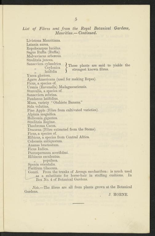 List of Fibres sent from the Royal Botanical Gardens,