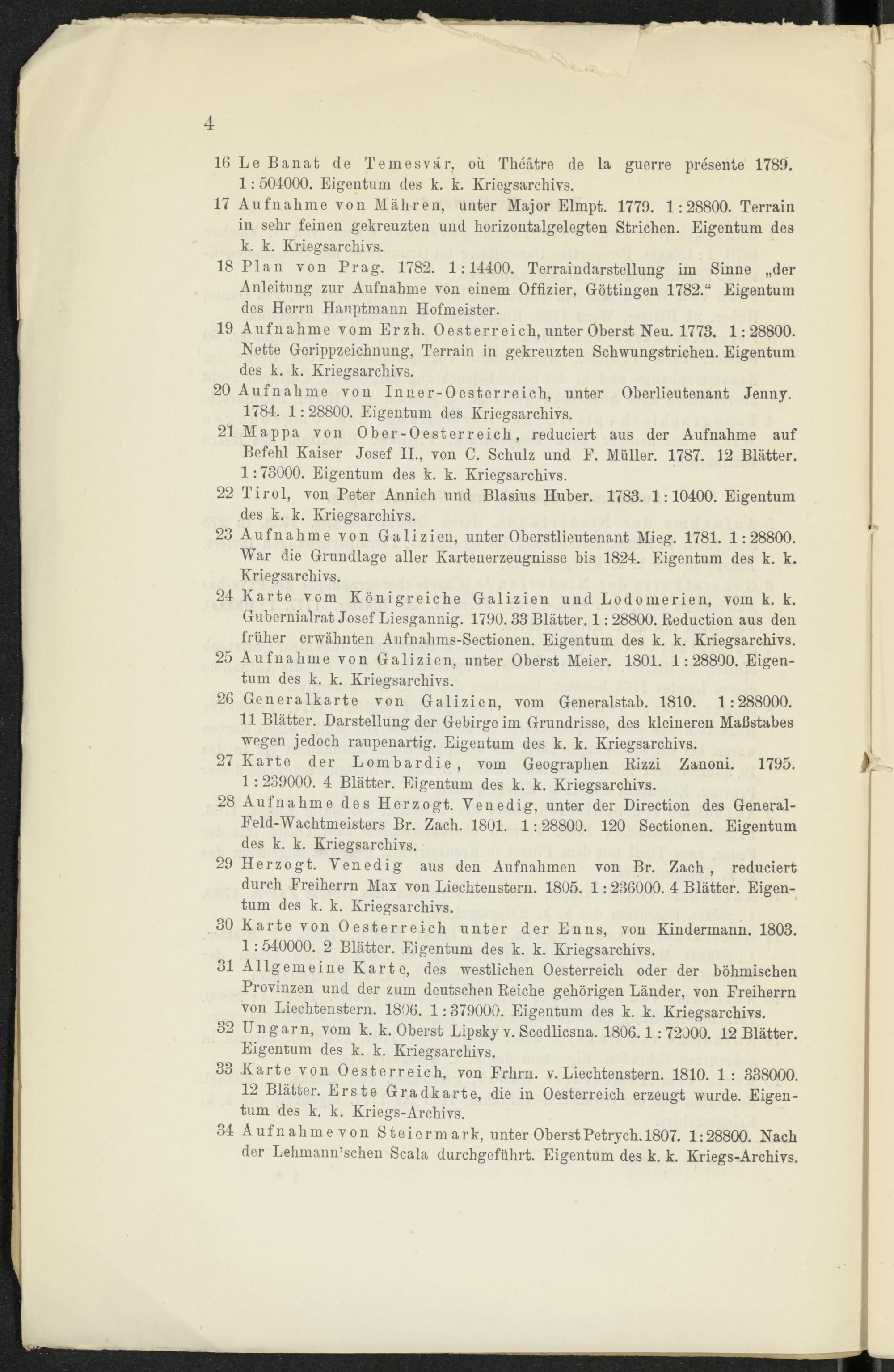 29 Herzogt. Venedig aus den Aufnahmen von Br. Zach, reduciert durch Freiherrn Max von Liechtenstern. 1805. 1: 236000. 4 Blätter. Eigentum des k. k. Kriegsarchivs.