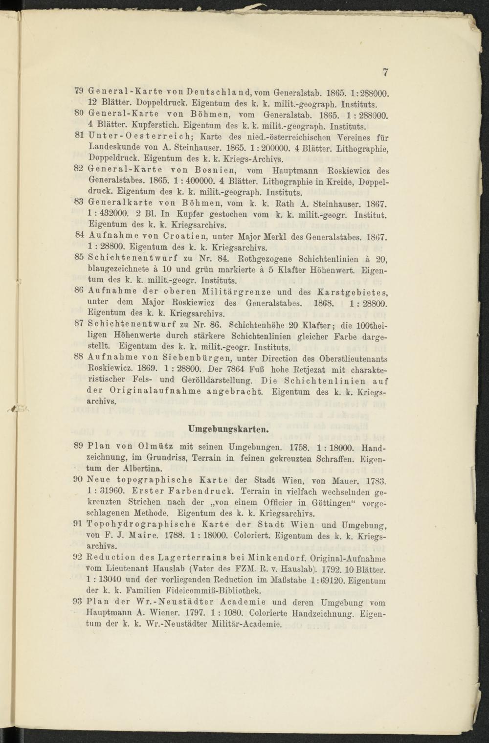 90 Neue topographische Karte der Stadt Wien, von Mauer. 1783. 1:31960. Erster Farbendruck. Terrain in vielfach wechselnden gekreuzten Strichen nach der „von einem Offleier in Göttingen“ vorgeschlagenen Methode. Eigentum des k. k. Kriegsarchivs.