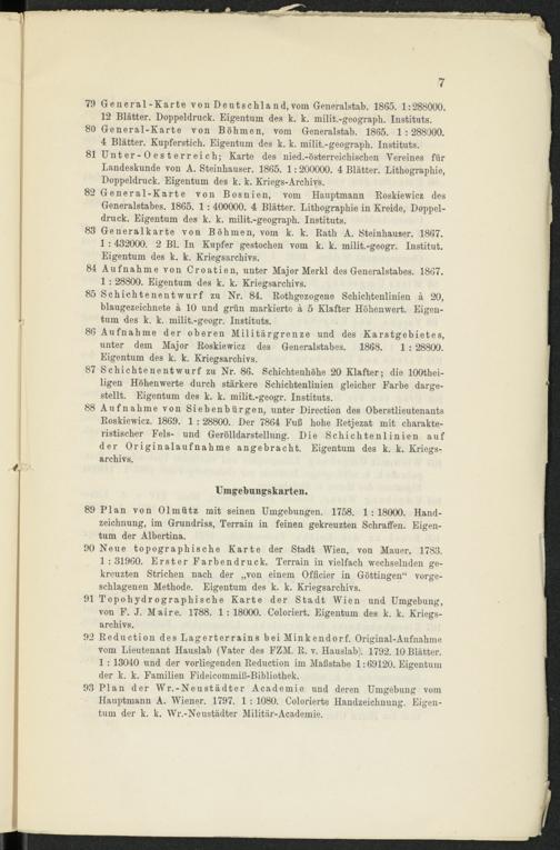 92 Reduction des Lagerterrains bei Minkendorf. Original-Aufnahme vom Lieutenant Hauslab (Vater des FZM. R. v. Hauslab). 1792. 10 Blätter. 1 :13040 und der vorliegenden Reduction im Maßstabe 1:69120. Eigentum der k. k. Familien Fideicommiß-Bibliothek.