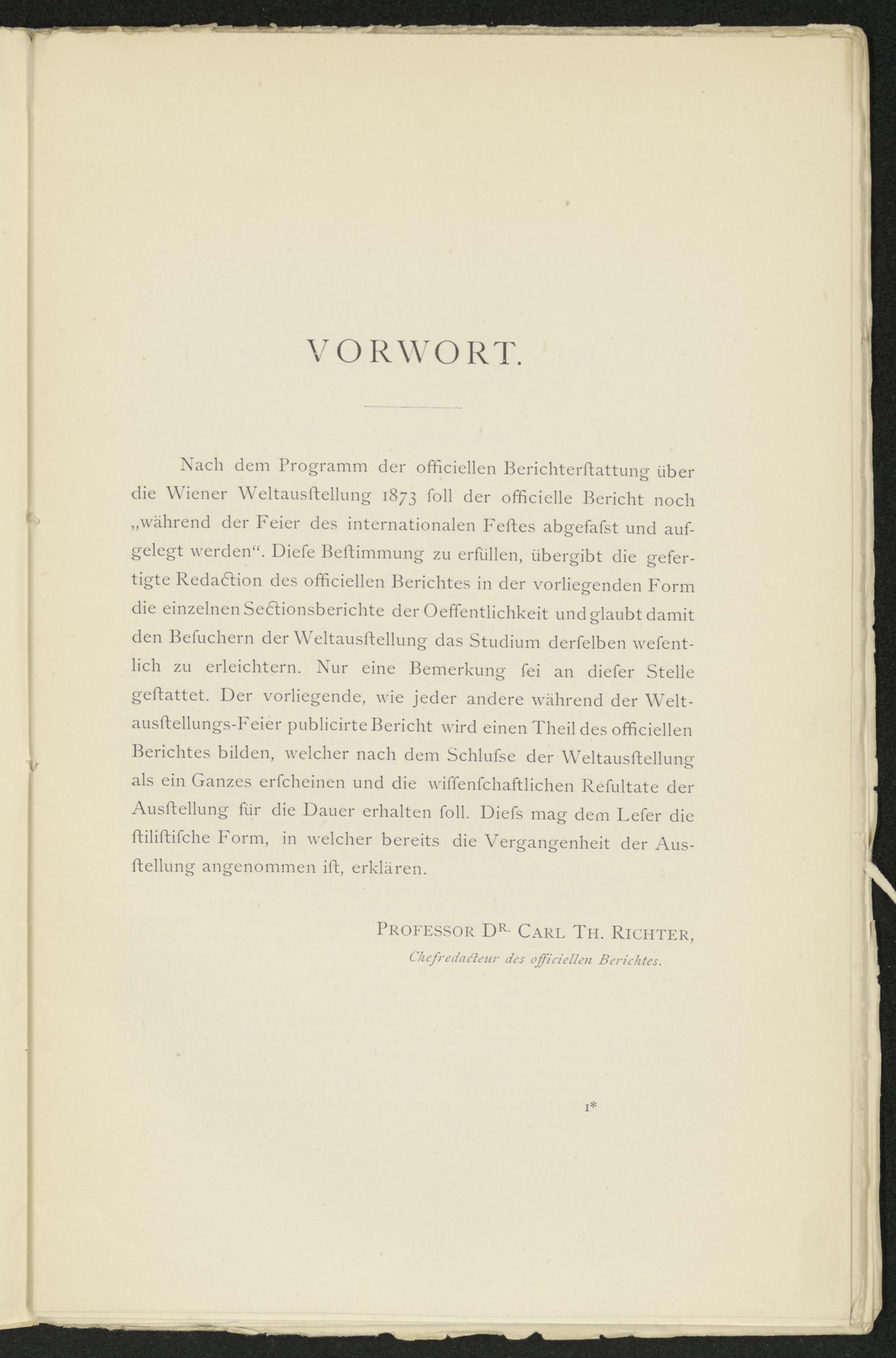 Nach dem Programm der offiziellen Berichterftattung über die Wiener Weltausftellung 1873 foll der officielle Bericht noch „während der Feier des internationalen Feftes abgefafst und aufgelegt werden“. Diefe Beftimmung zu erfüllen, übergibt die gefertigte Redadtion des officiellen Berichtes in der vorliegenden P'orm die einzelnen Sedlionsberichte der Oeffentlichkeit und glaubt damit den Befuchern der Weltausftellung das Studium derfelben wefent- lich zu erleichtern. Nur eine Bemerkung fei an diefer Stelle geftattet. Der vorliegende, wie jeder andere während der Welt- ausftellungs-Feier publicirte Bericht wird einen Theil des officiellen Berichtes bilden, welcher nach dem Schlufse der Weltausftellung als ein Ganzes erfcheinen und die wiffenfchaftlichen Refultate der Ausftellung für die Dauer erhalten foll. Diefs mag dem Lefer die ftiliftifche P'orm, in welcher bereits die Vergangenheit der Ausftellung angenommen ift, erklären.