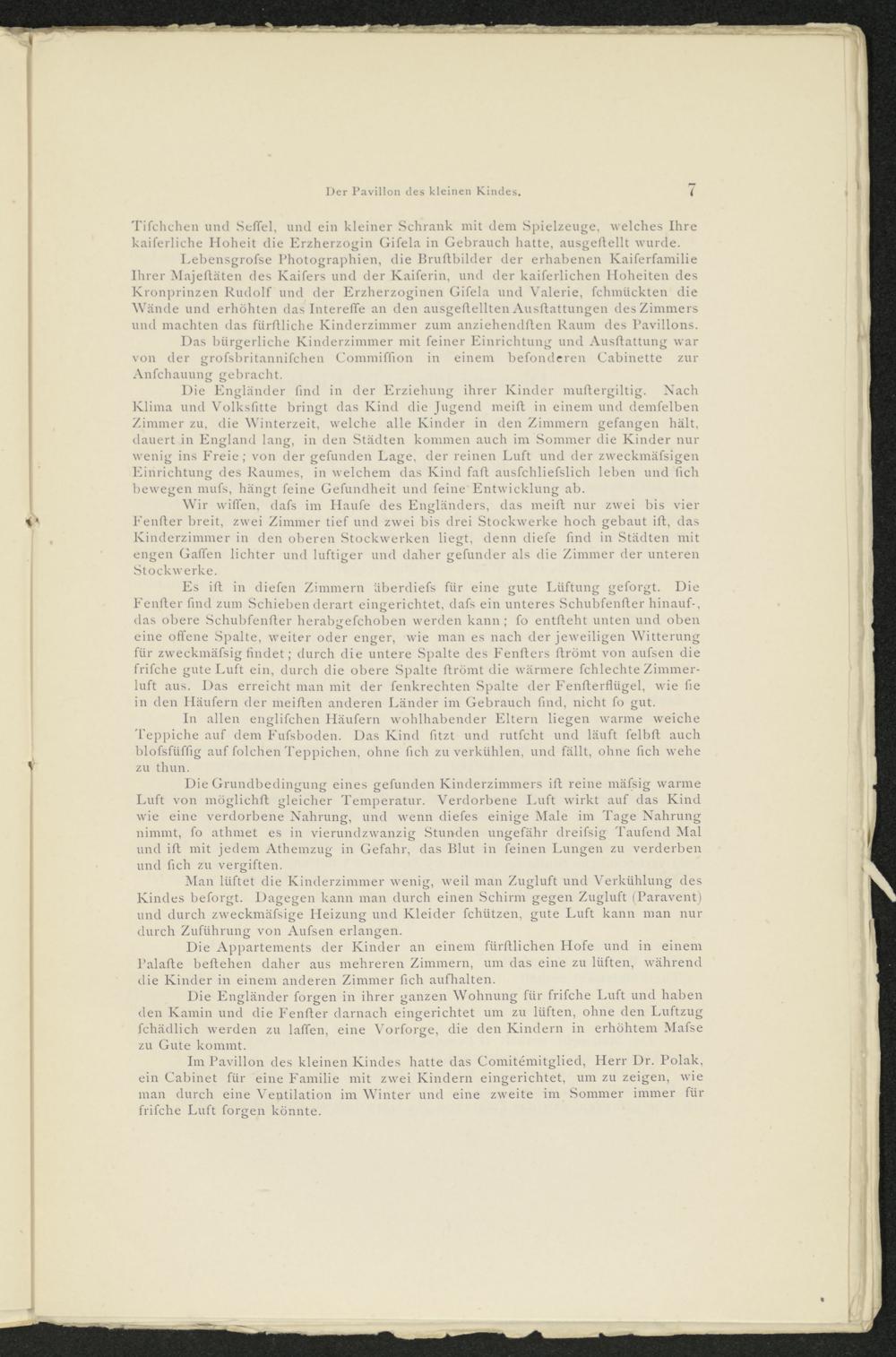 Lebensgrofse Photographien, die Bruftbilder der erhabenen Kaiferfamilie Ihrer Majedäten des Kaifers und der Kaiferin, und der kaiferlichen Hoheiten des Kronprinzen Rudolf und der Erzherzoginen Gifela und Valerie, fchmückten die Wände und erhöhten das Intereffe an den ausgedellten Ausdattungen des Zimmers und machten das fiirftliche Kinderzimmer zum anziehendden Raum des Pavillons.