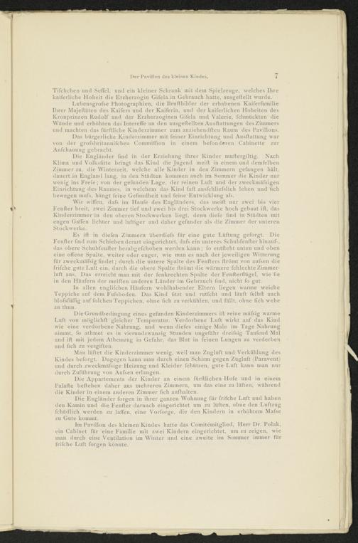 Im Pavillon des kleinen Kindes hatte das Comitemitglied, Herr Dr. Polak, ein Cabinet für eine Familie mit zwei Kindern eingerichtet, um zu zeigen, wie man durch eine Ventilation im Winter und eine zweite im Sommer immer für frifche Luft forgen könnte.