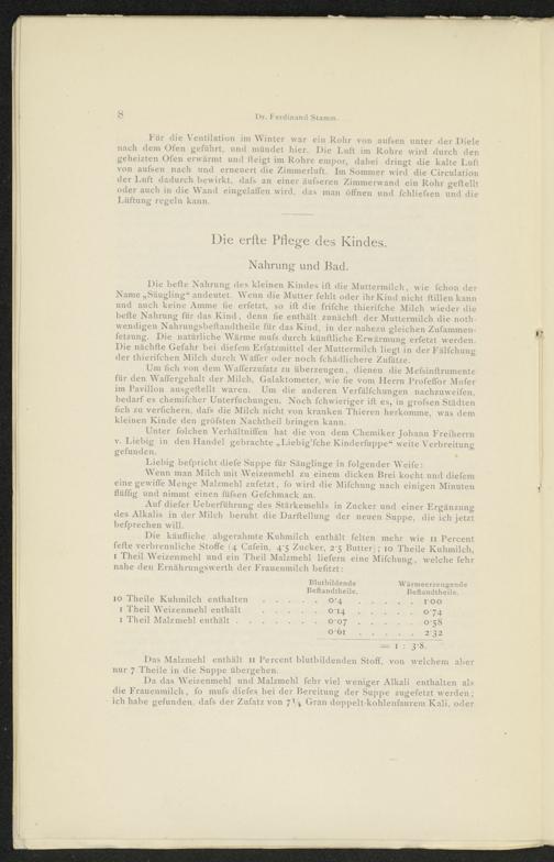 Die hefte Nahrung des kleinen Kindes ift die Muttermilch, wie fchon der Name „Säugling“ andeutet. Wenn die Mutter fehlt oder ihr Kind nicht ftillen kann und auch keine Amme fie erfetzt, so ift die frifche thierifche Milch wieder die hefte Nahrung für das Kind, denn fie enthält zunächft der Muttermilch die noth- wendigen Nahrungsbeftandtheile für das Kind, in der nahezu gleichen Zufammen- fetzung. Die natürliche Wärme mufs durch künftliche Erwärmung erfetzt werden. Die nächfte Gefahr hei diefem Erfatzmittel der Muttermilch liegt in der Eälfchung der thierifchen Milch durch Waffer oder noch fchädlichere Zufätze.