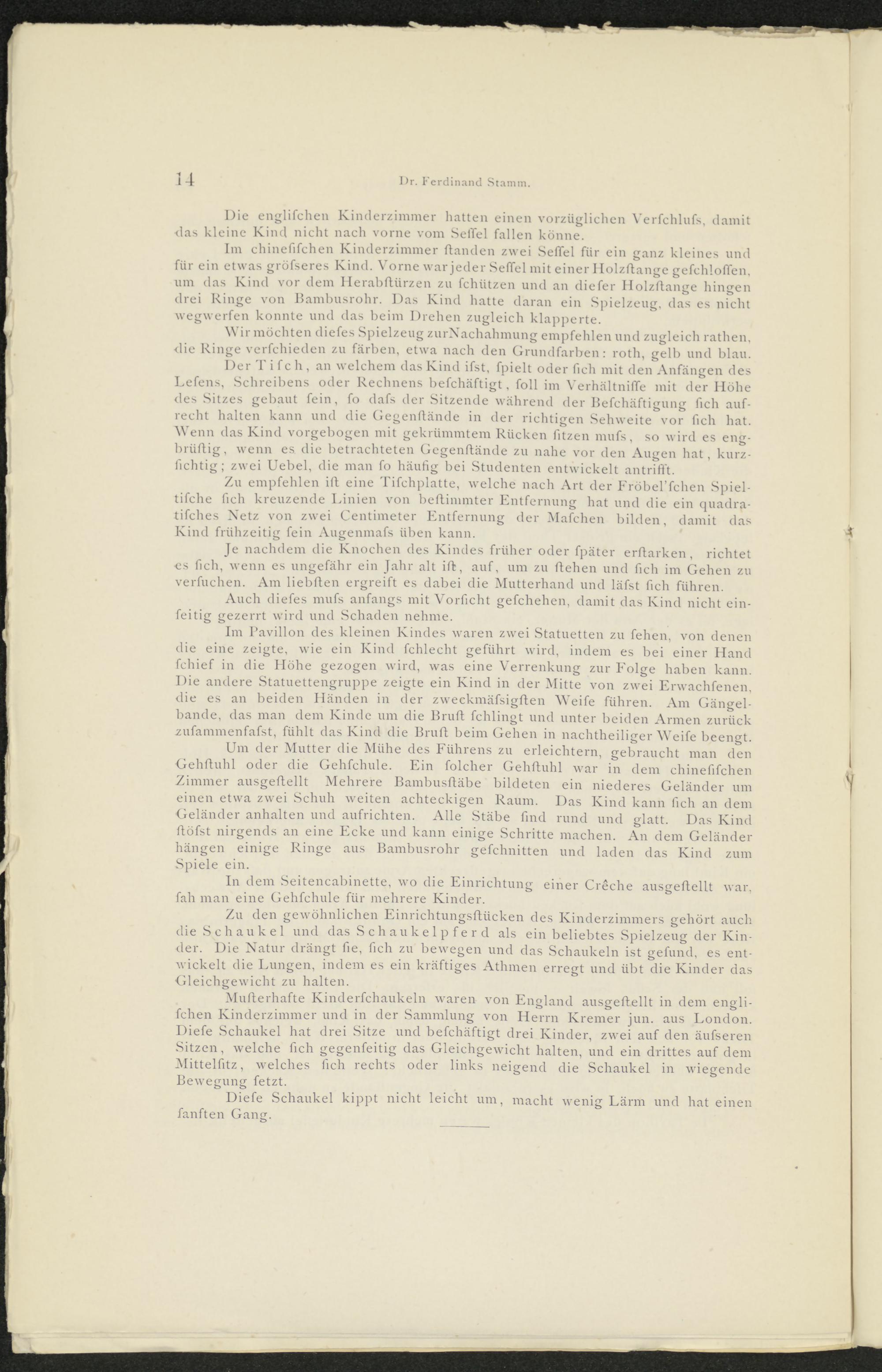 Um der Mutter die Mühe des Führens zu erleichtern, gebraucht man den Gehftuhl oder die Gehfchule. Ein folcher Gehftuhl war in dem chinefifchen Zimmer ausgeftellt Mehrere Bambusftäbe bildeten ein niederes Geländer um einen etwa zwei Schuh weiten achteckigen Raum. Das Kind kann fich an dem Geländer anhalten und aufrichten. Alle Stäbe find rund und glatt. Das Kind ftöfst nirgends an eine Ecke und kann einige Schritte machen. An dem Geländer hängen einige Ringe aus Bambusrohr gefchnitten und laden das Kind zum Spiele ein.