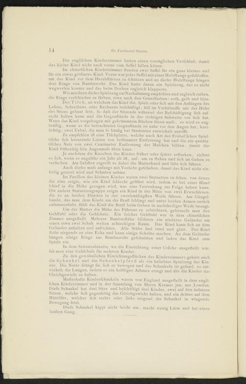 Im chinefifchen Kinderzimmer Händen zwei Seffel für ein ganz kleines und für ein etwas gröfseres Kind. Vorne war jeder Seffel mit einer Ilolzftange gefchloffen. um das Kind vor dem Ilerabflürzen zu fchiitzen und an diefer Ilolzftange hingen drei Ringe von Bambusrohr. Das Kind hatte daran ein Spielzeug, das es nicht wegwerfen konnte und das beim Drehen zugleich klapperte.