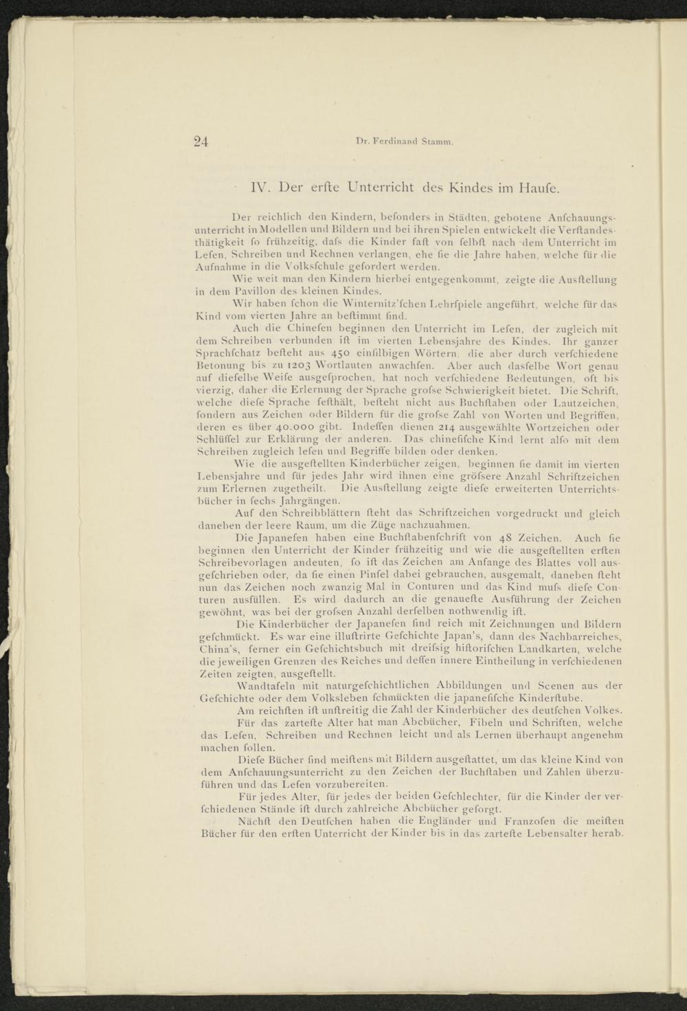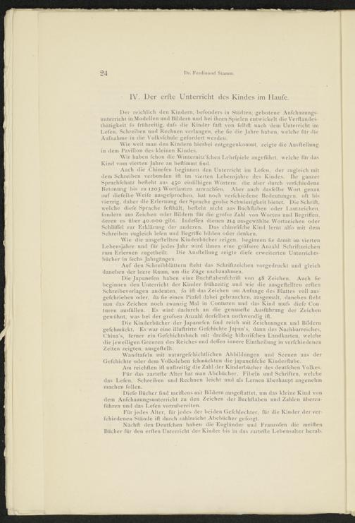 W r ie die ausgeftellten Kinderbücher zeigen, beginnen fie damit im vierten Lebensjahre und für jedes Jahr wird ihnen eine gröfsere Anzahl Schriftzeichen zum Erlernen zugetheilt. Die Ausftellung zeigte diefe erweiterten Unterrichtsbücher in fechs Jahrgängen.