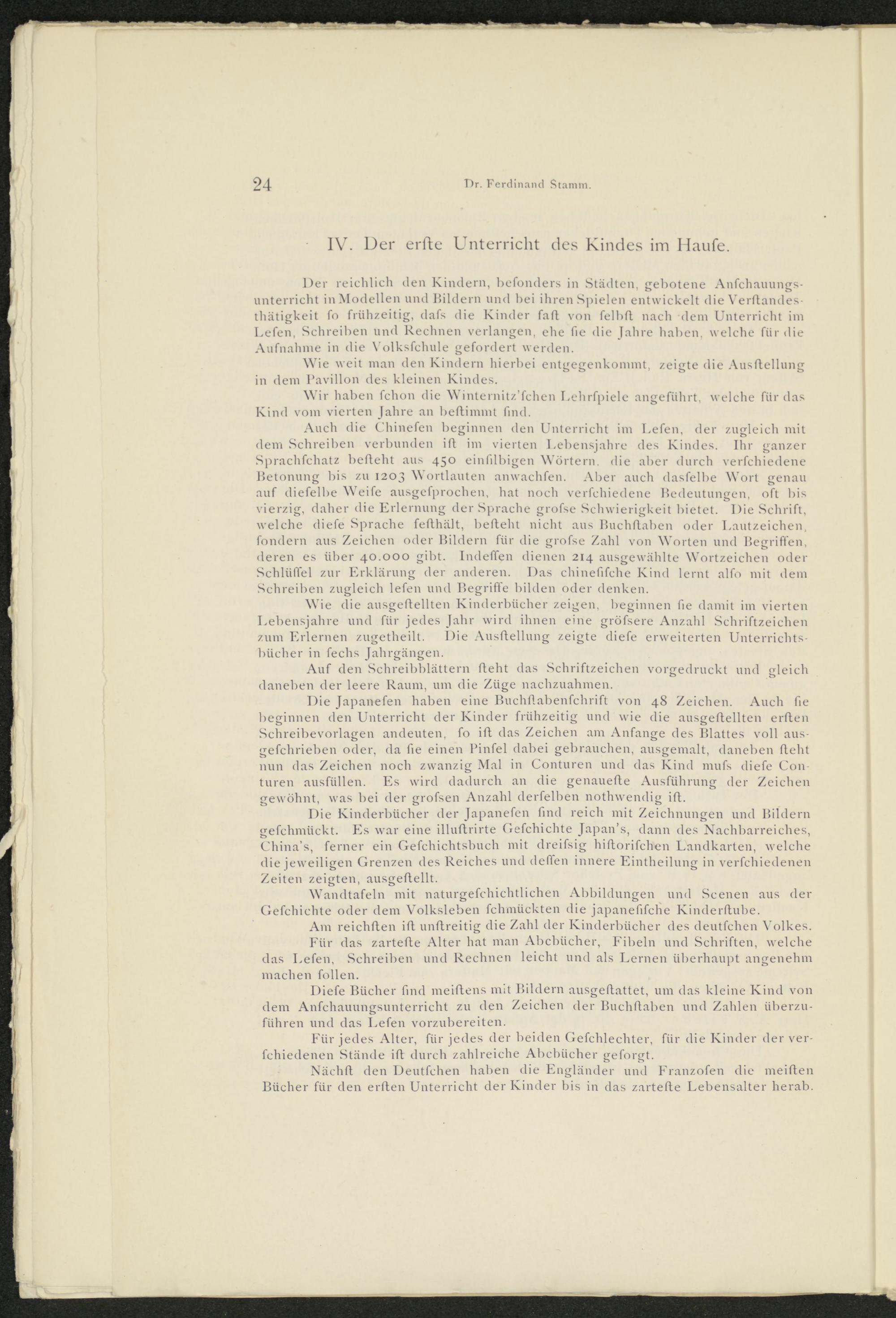 Auch die Chinefen beginnen den Unterricht im Lefen, der zugleich mit dem Schreiben verbunden ift im vierten Lebensjahre des Kindes. Ihr ganzer Sprachfchatz befleht aus 450 einlilbigen Wörtern, die aber durch verfchiedene Betonung bis zu 1203 Wortlauten anwachfen. Aber auch dasfelbe W'orl genau auf diefelbe Weife ausgesprochen, hat noch verfchiedene Bedeutungen, oft bis vierzig, daher die Erlernung der Sprache grofse Schwierigkeit bietet. Die Schrift, welche diefe Sprache fefthält, befleht nicht aus Buchflaben oder Lautzeichen, fondern aus Zeichen oder Bildern für die grofse Zahl von Worten und Begriffen, deren es über 40.000 gibt. IndelTen dienen 214 ausgewählte Wortzeichen oder Schlüffe 1 zur Erklärung der anderen. Das chinefifche Kind lernt alfo mit dem Schreiben zugleich lefen und Begrifte bilden oder denken.