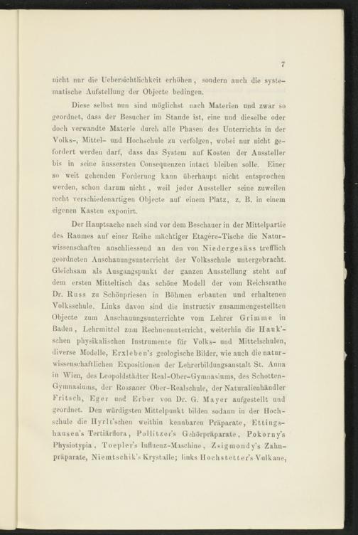Der Hauptsache nach sind vor dem Beschauer in der Mittelpartie des Raumes auf einer Reihe mächtiger Etagere-Tische die Naturwissenschaften anschliessend an den von Niedergesäss trefflich geordneten Anschauungsunterricht der Volksschule untergebracht. Gleichsam als Ausgangspunkt der ganzen Ausstellung steht auf dem ersten Mitteltisch das schöne Modell der vom Reichsrathe Dr. Russ zu Schönpriesen in Böhmen erbauten und erhaltenen Volksschule. Links davon sind die instructiv zusammengestellten Objecte zum Anschauungsunterrichte vom Lehrer Grimme in Baden, Lehrmittel zum Rechnenunterricht, weiterhin die Hauk’- schen physikalischen Instrumente für Volks- und Mittelschulen, diverse Modelle, Erxleben’s geologische Bilder, wie auch die naturwissenschaftlichen Expositionen der Lehrerbildungsanstalt St. Anna in Wien, des Leopoldstädter Real-Ober-Gymnasiums, des Schotten- Gymnasiums, der Rossauer Ober-Realschule, der Naturalienhändler Fritsch, Eger und Erber von Dr. G. Mayer aufgestellt und geordnet. Den würdigsten Mittelpunkt bilden sodann in der Hochschule die Ilyrlt'sehen weithin kennbaren Präparate, Ettings- hausen’s Tertiärflora, Pollitzer’s Gehörpräparate, Pokorny’s Physiotypia, Toepler’s Influenz-Maschine, Zsigmondy’s Zahnpräparate, Niemtschik’s Krystalle; links IIochstetter’s Vulkane,