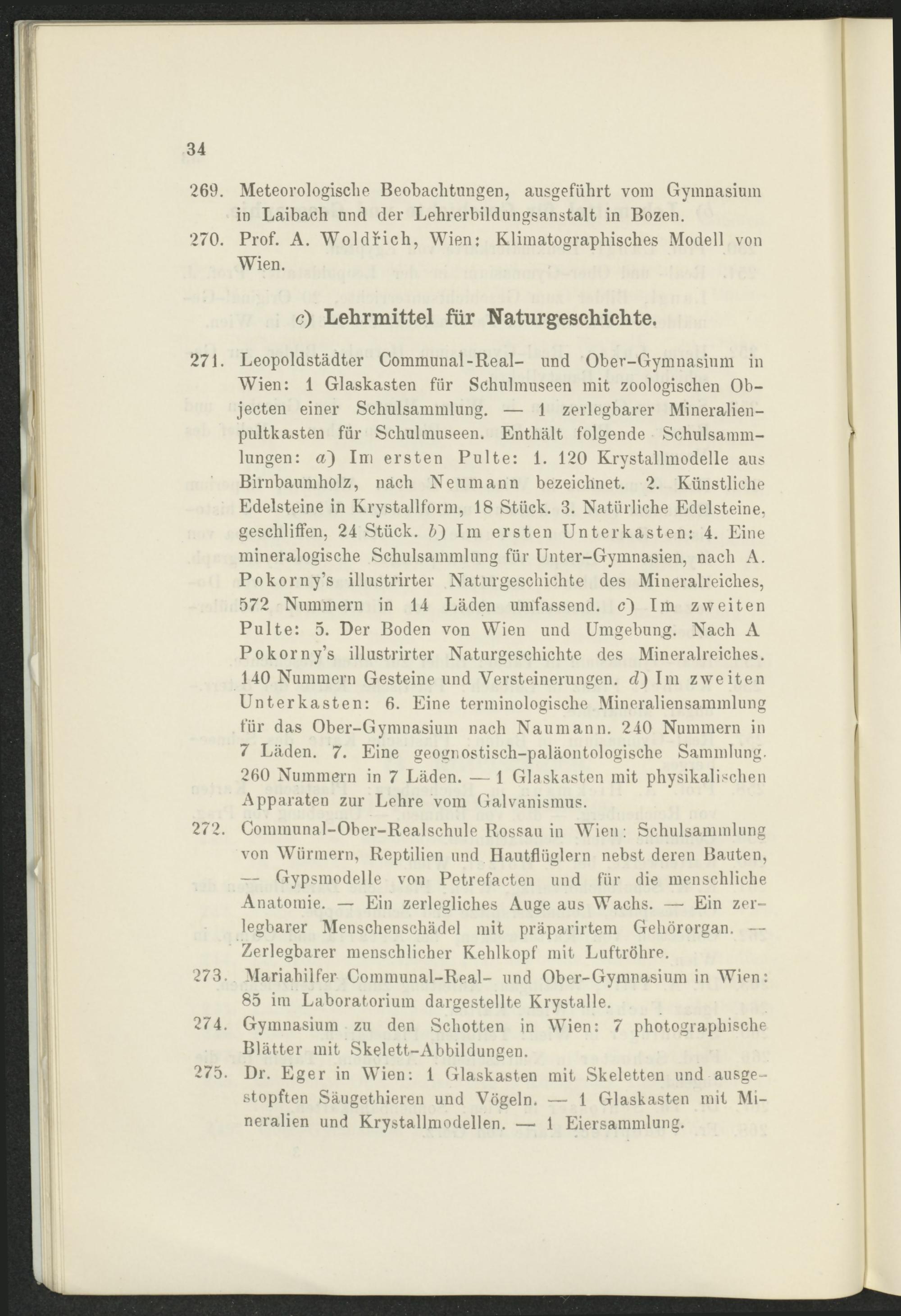 271. Leopoldstädter Communal -Real- und Ober-Gymnasium in Wien: 1 Glaskasten für Schulmuseen mit zoologischen Objecten einer Schulsammlung. — 1 zerlegbarer Mineralienpultkasten für Schulmuseen. Enthält folgende Schulsamm- lungen: a~) Im ersten Pulte: 1. 120 Krystallmodelle aus Birnbaumholz, nach Neumann bezeichnet. 2. Künstliche Edelsteine in Krystallform, 18 Stück. 3. Natürliche Edelsteine, geschliffen, 24 Stück. &) Im ersten Unterkasten: 4. Eine mineralogische Schulsammlung für Unter-Gymnasien, nach A. Pokorny’s illustrirter Naturgeschichte des Mineralreiches, 572 Nummern in 14 Läden umfassend, c) Im zweiten Pulte: 5. Der Boden von Wien und Umgebung. Nach A Pokorny’s illustrirter Naturgeschichte des Mineralreiches. 140 Nummern Gesteine und Versteinerungen, d) Im zweiten Unterkasten: 6. Eine terminologische Mineraliensammlung für das Ober-Gynmasium nach Naumann. 240 Nummern in 7 Läden. 7. Eine geognostisch-paläontologische Sammlung. 260 Nummern in 7 Läden. — 1 Glaskasten mit physikalischen Apparaten zur Lehre vom Galvanismus.