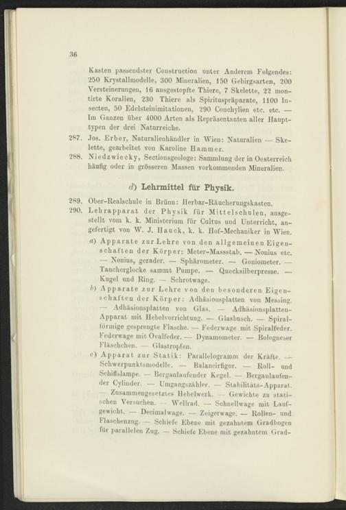 290. Lehrapparat der Physik für Mittelschulen, ausgestellt vom k. k. Ministerium für Cultus und Unterricht, angefertigt von W. J. Hauck, k. k. Hof-Mechaniker in Wien. «) Apparate zur Lehre von den allgemeinen Eigenschaften der Körper: Meter-Massstab. — Nonius etc. — Nonius, gerader. — Sphärometer. — Goniometer. — Taucherglocke sammt Pumpe. — Quecksilberpresse. — Kugel und Ring. — Schrotwage.