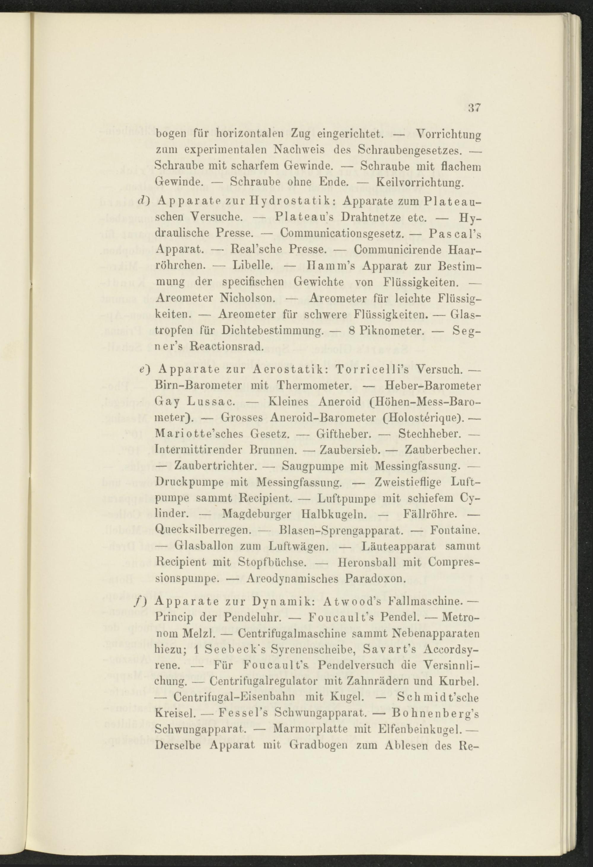 d ) Apparate zur Hydrostatik: Apparate zumPlateau- schen Versuche. — Plateau’s Drahtnetze etc. — Hydraulische Presse. — Communicationsgesetz.— Pascal’s Apparat. — Real’sche Presse. — Communicirende Haarröhrchen. — Libelle. — Hamm’s Apparat zur Bestimmung der specifischen Gewichte von Flüssigkeiten. — Areometer Nicholson. — Areometer für leichte Flüssigkeiten. — Areometer für schwere Flüssigkeiten. — Glastropfen für Dichtebestimmung. — 8 Piknometer. — Segne r’s Reactionsrad.