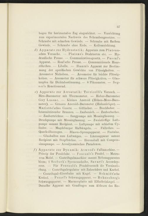 <0 Apparate zur Aerostatik: Torricelli’s Versuch. — Birn-Barometer mit Thermometer. — Heber-Barometer Gay Lussac. — Kleines Aneroid (Höhen-Mess-Baro- meter). — Grosses Aneroid-Barometer (Holosterique). — Mariotte’sches Gesetz. — Giftheber. — Stechheber. — Intermittirender Brunnen. — Zaubersieb. — Zauberbecher. — Zaubertrichter. — Säugpumpe mit Messingfassung. — Druckpumpe mit Messingfassung. — Zweistieflige Luftpumpe sammt Recipient. — Luftpumpe mit schiefem Cylinder. — Magdeburger Halbkugeln. — Fällröhre. — Quecksilberregen. — Blasen-Sprengapparat. — Fontaine. — Glasballon zum Luftwägen. — Läuteapparat sammt Recipient mit Stopfbüchse. — Heronsball mit Compres- sionspumpe. — Areodynamisches Paradoxon.