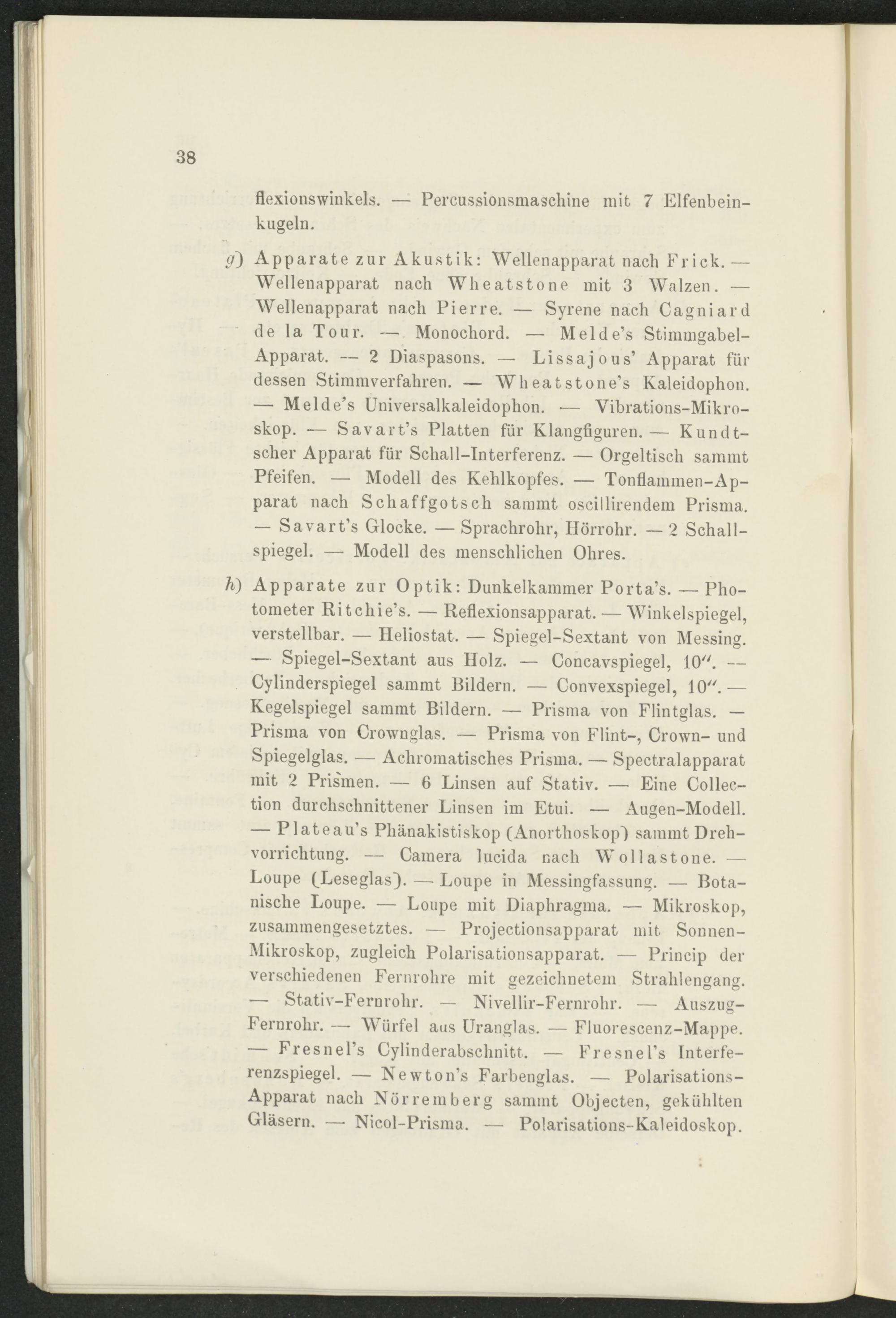 h ) Apparate zur Optik: Dunkelkammer Porta’s. — Photometer Ritchie’s. — Reflexionsapparat. — Winkelspiegel, verstellbar. — Heliostat. — Spiegel-Sextant von Messing. — Spiegel-Sextant aus Holz. — Concavspiegel, 10". — Cylinderspiegel sammt Bildern. — Convexspiegel, 10".— Kegelspiegel sammt Bildern. — Prisma von Flintglas. — Prisma von Crownglas. — Prisma von Flint-, Crown- und Spiegelglas. — Achromatisches Prisma. — Spectralapparat mit 2 Prismen. — 6 Linsen auf Stativ. — Eine Collection durchschnittener Linsen im Etui. — Augen-Modell. — Plateau’s Pliänakistiskop (Anorthoskop') sammt Drehvorrichtung. — Camera lucida nach Wollastone. — Loupe (Leseglas}. — Loupe in Messingfassung. — Botanische Loupe. — Loupe mit Diaphragma. — Mikroskop, zusammengesetztes. — Projectionsapparat mit Sonnen- Mikroskop, zugleich Polarisationsapparat. — Princip der verschiedenen Fernrohre mit gezeichnetem Strahlengang. — Stativ-Fernrohr. — Nivellir-Fernrohr. — Auszug- Fernrohr. — Würfel aus Uranglas. — Fluorescenz-Mappe. — Fresnel’s Cylinderabschnitt. — Fresnel’s Interferenzspiegel. — Newton’s Farbenglas. — Polarisations- Apparat nach Nürremberg sammt Objecten, gekühlten Gläsern. —■ Nicol-Prisma. — Polarisations- Kaleidoskop.