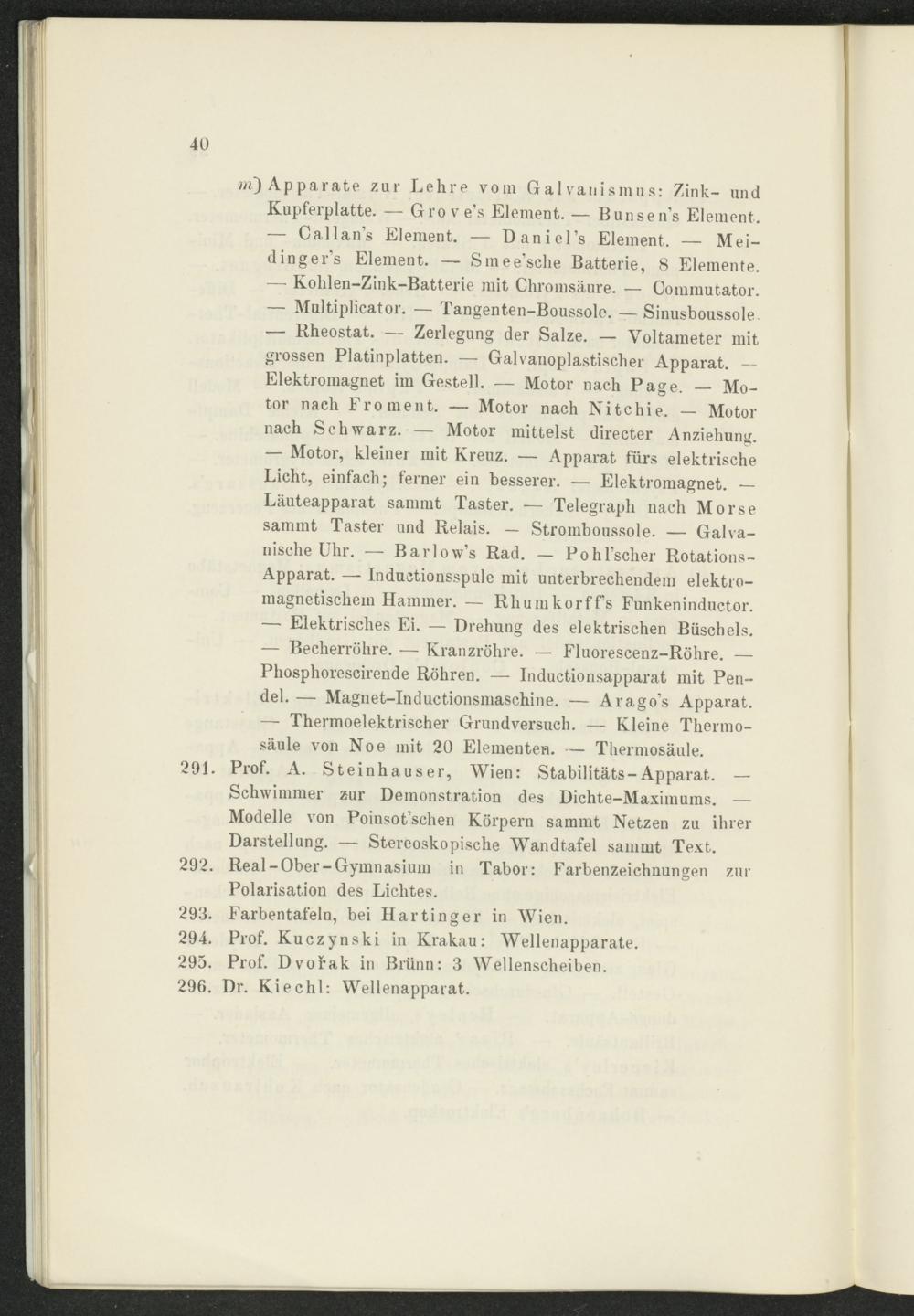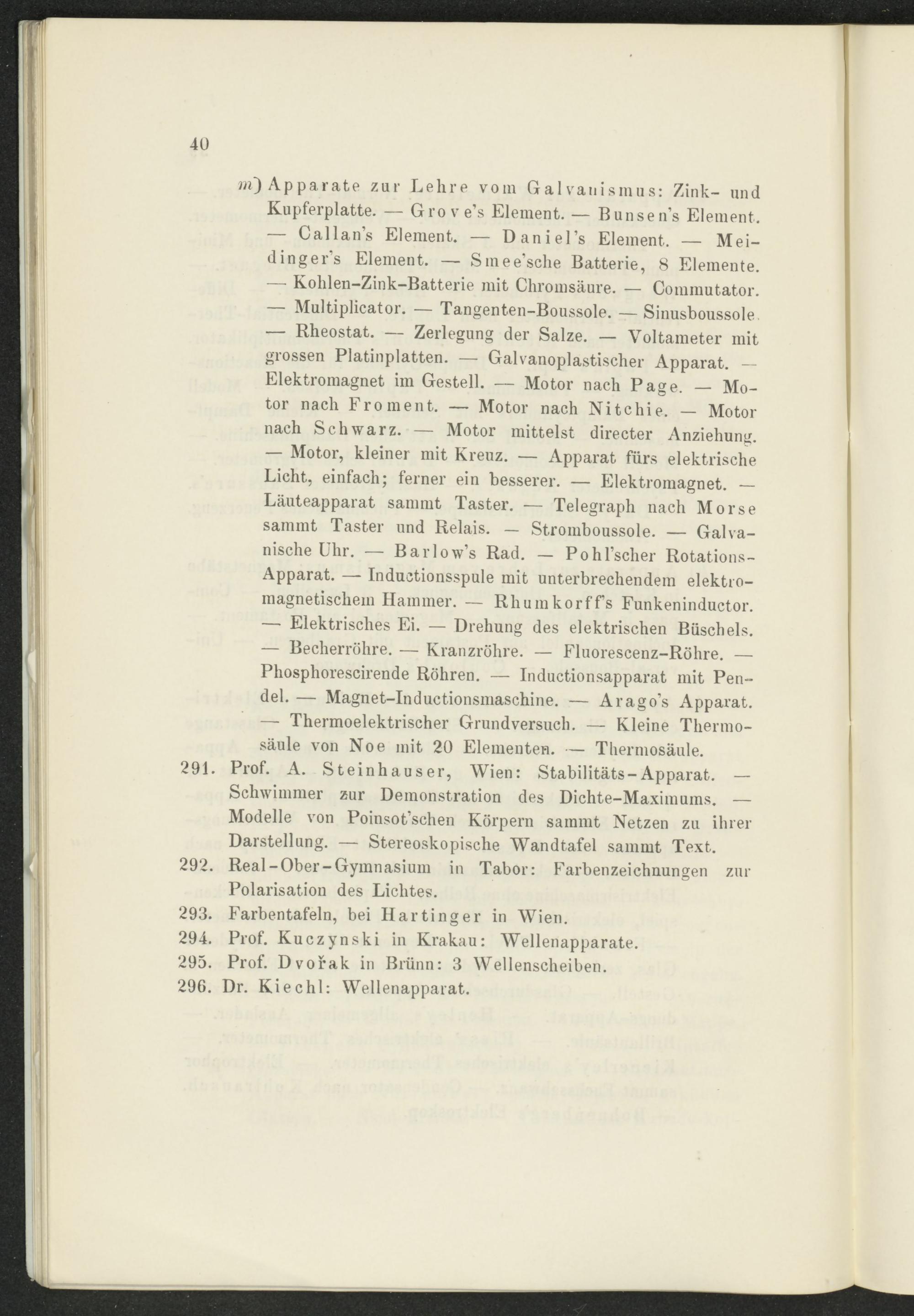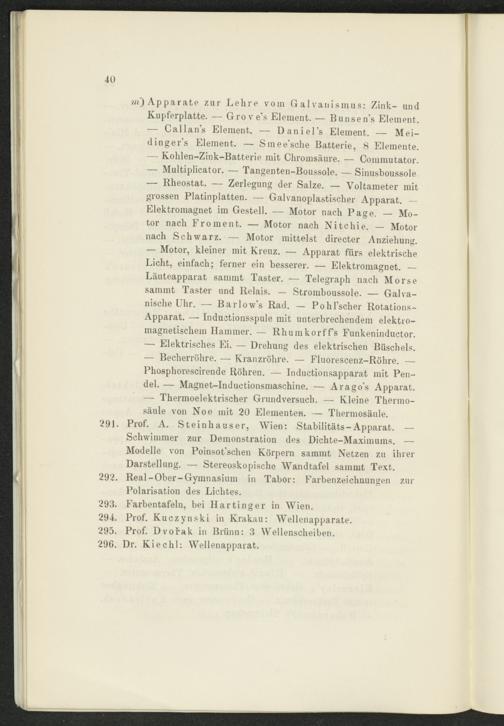 Apparate zur Lehre vom Galvanismus: Zink- und Kupferplatte. — Grove’s Element. — Bunsen’s Element. — Callan’s Element. — Daniel’s Element. — Mei- dinger’s Element. — Smee’sche Batterie, 8 Elemente. — Kolilen-Zink-Batterie mit Chromsäure. — Commutator. — Multiplicator. — Tangenten-Boussole. — Sinusboussole — Rheostat. — Zerlegung der Salze. — Voltameter mit grossen Platinplatten. — Galvanoplastischer Apparat. -- Elektromagnet im Gestell. — Motor nach Page. — Motor nach Pro ment. — Motor nach Nitchie. — Motor nach Schwarz. — Motor mittelst directer Anziehung. — Motor, kleiner mit Kreuz. — Apparat fürs elektrische Licht, einfach; ferner ein besserer. — Elektromagnet. — Läuteapparat sammt Taster. — Telegraph nach Morse sammt Taster und Relais. — Stromboussole. — Galvanische Uhr. — Barlow’s Rad. — Pohl’scher Rotations- Apparat. — Inductionsspule mit unterbrechendem elektromagnetischem Hammer. — Rhumkorffs Funkeninductor. — Elektrisches Ei. — Drehung des elektrischen Büschels. — Becherröhre. — Kranzröhre. — Fluorescenz-Röhre. — Phosphorescirende Röhren. — Inductionsapparat mit Pendel. — Magnet-Inductionsmasehine. — Arago’s Apparat. — Thermoelektrischer Grundversuch. — Kleine Therrno- säule von Noe mit 20 Elementen. — Thermosäule.