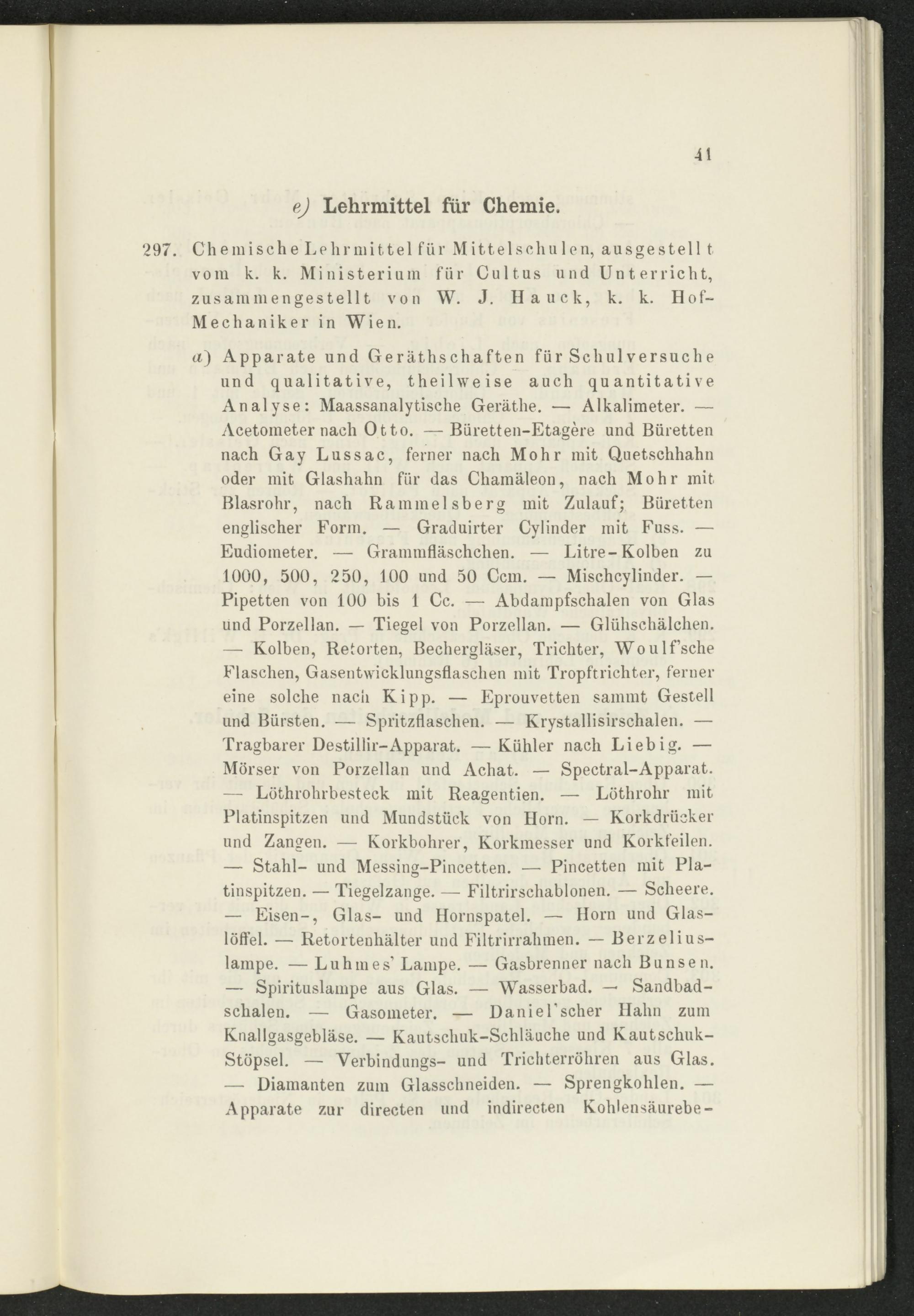 297. Chemische Lehrmittel für Mittelschu len, ausgestell t vom k. k. Ministerium für Cult.us und Unterricht, zusammengestellt von W. J. Hauck, k. k. Hof- Mechaniker in Wien.
