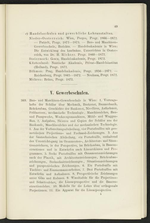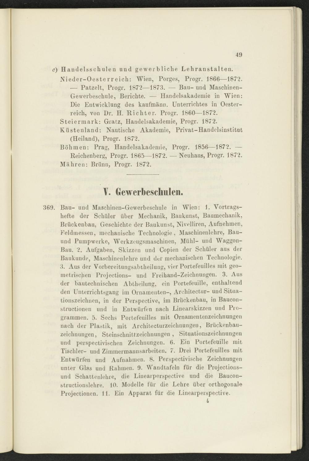 c) Handelsschulen und gewerbliche Lehranstalten. Nieder-Oesterreich: Wien, Porges, Progr. 1866—1872. — Patzelt, Progr. 1872—1873. — Bau- und Maschinen- Gewerbeschule, Berichte. — Handelsakademie in Wien: Die Entwicklung des kaufmänn. Unterrichtes in Oesterreich, von Dr. H. Richter. Progr. 1860—1872. Steiermark: Gratz, Handelsakademie, Progr. 1872. Küstenland: Nautische Akademie, Privat-Handelsinstitut (Heiland), Progr. 1872.