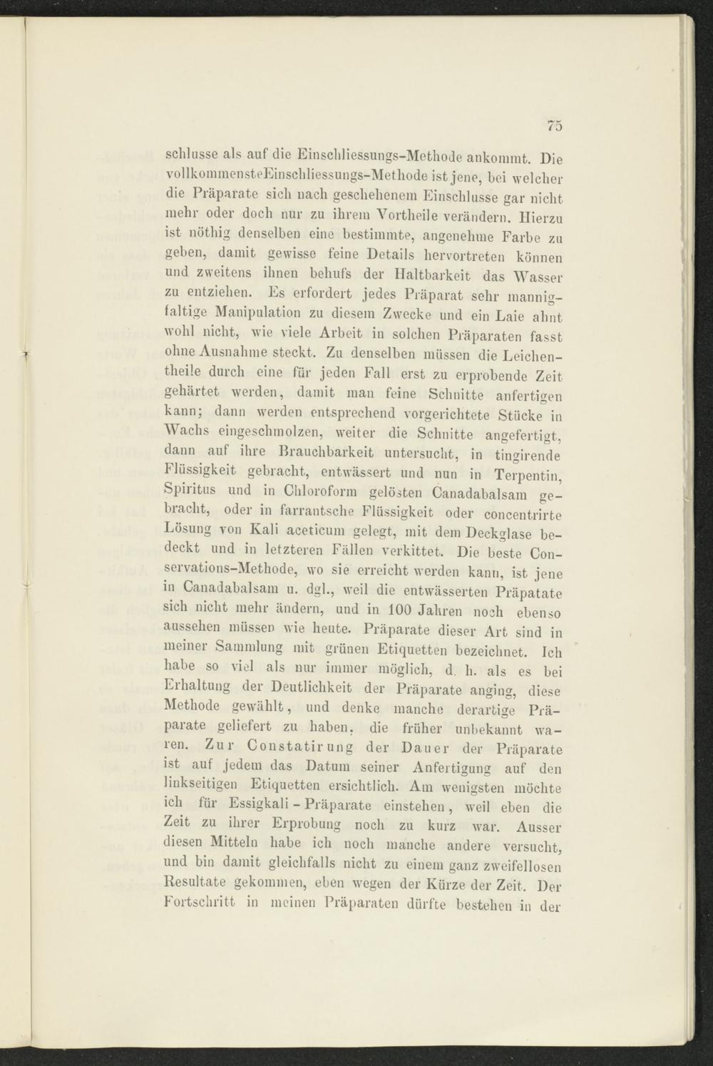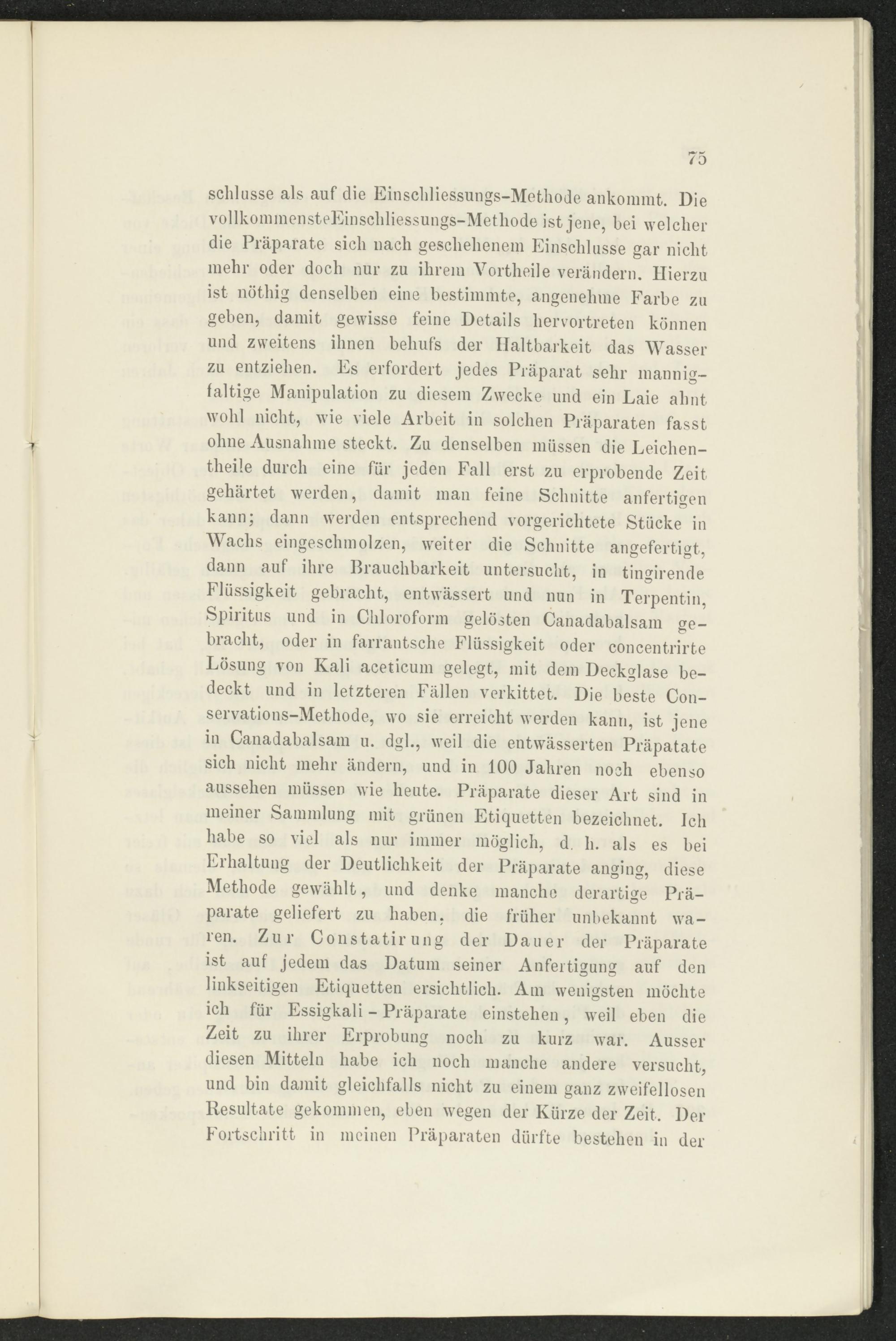 Schlüsse als auf die Einschliessungs-Methode ankommt. Die vollkommensteEinschliessungs-Metliode ist jene, bei welcher die Präparate sich nach geschehenem Einschlüsse gar nicht mehr oder doch nur zu ihrem Vortheile verändern. Hierzu ist nöthig denselben eine bestimmte, angenehme Farbe zu geben, damit gewisse feine Details hervortreten können und zweitens ihnen behufs der Haltbarkeit das Wasser zu entziehen. Es erfordert jedes Präparat sehr mannigfaltige Manipulation zu diesem Zwecke und ein Laie ahnt wohl nicht, wie viele Arbeit in solchen Präparaten fasst ohne Ausnahme steckt. Zu denselben müssen die Leichen- theile durch eine für jeden Fall erst zu erprobende Zeit gehärtet werden, damit man feine Schnitte anfertigen kann; dann werden entsprechend vorgerichtete Stücke in Wachs eingeschmolzen, weiter die Schnitte angefertigt, dann auf ihre Brauchbarkeit untersucht, in tingirende Flüssigkeit gebracht, entwässert und nun in Terpentin, Spiritus und in Chloroform gelösten Canadabalsam gebracht, oder in farrantsche Flüssigkeit oder concentrirte Lösung von Kali aceticum gelegt, mit dem Deckglase bedeckt und in letzteren Fällen verkittet. Die beste Conservations-Methode, wo sie erreicht werden kann, ist jene in Canadabalsam u. dgl., weil die entwässerten Präpatate sich nicht mehr ändern, und in 100 Jahren noch ebenso aussehen müssen wie heute. Präparate dieser Art sind in meiner Sammlung mit grünen Etiquetten bezeichnet. Ich habe so viel als nur immer möglich, d. h. als es bei Erhaltung der Deutlichkeit der Präparate anging, diese Methode gewählt, und denke manche derartige Präparate geliefert zu haben, die früher unbekannt waren. Zur Constatirung der Dauer der Präparate ist auf jedem das Datum seiner Anfertigung auf den linkseitigen Etiquetten ersichtlich. Am wenigsten möchte ich für Essigkali - Präparate einstehen, weil eben die Zeit zu ihrer Erprobung noch zu kurz war. Ausser diesen Mitteln habe ich noch manche andere versucht, und bin damit gleichfalls nicht zu einem ganz zweifellosen Resultate gekommen, eben wegen der Kürze der Zeit. Der Fortschritt in meinen Präparaten dürfte bestehen in der