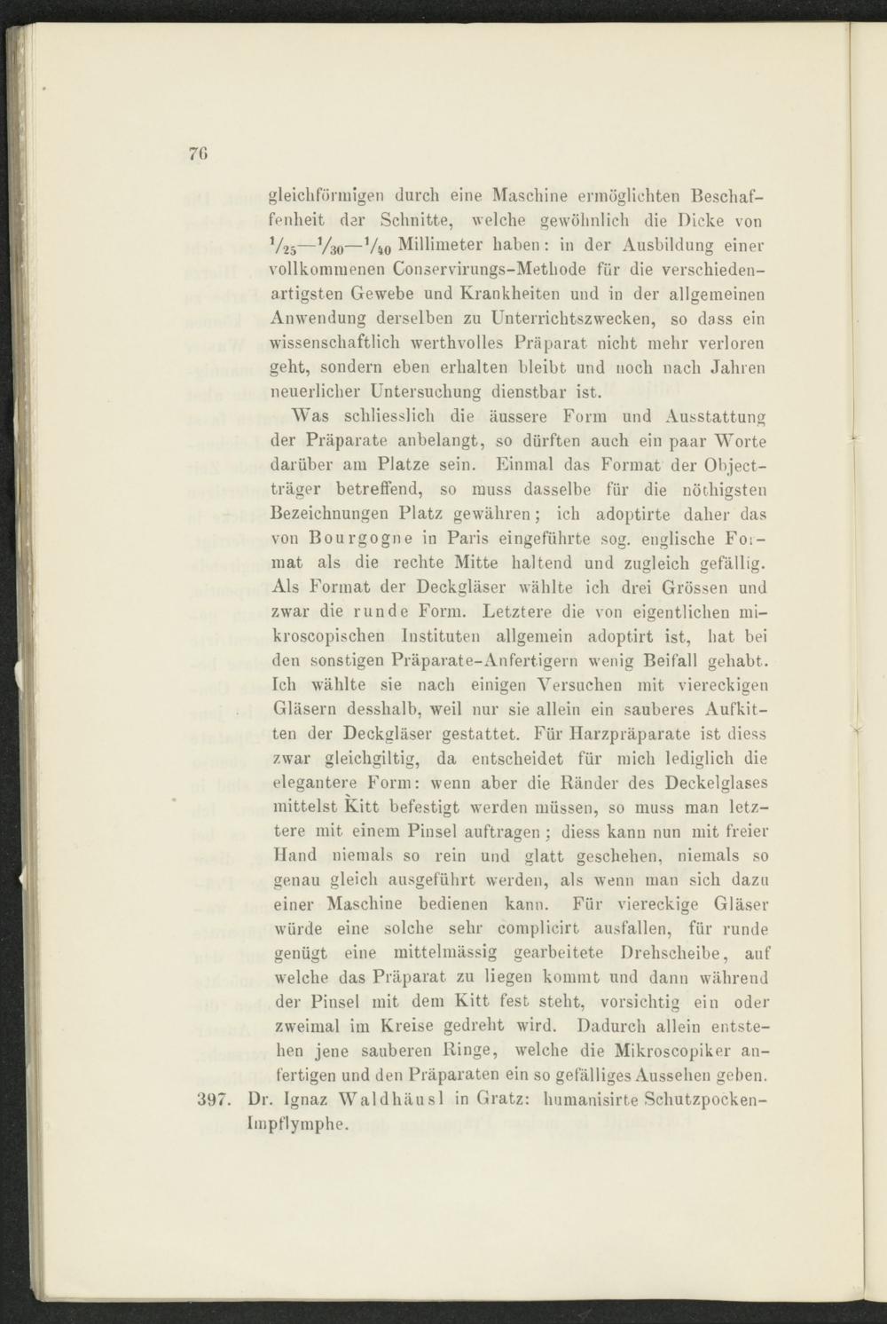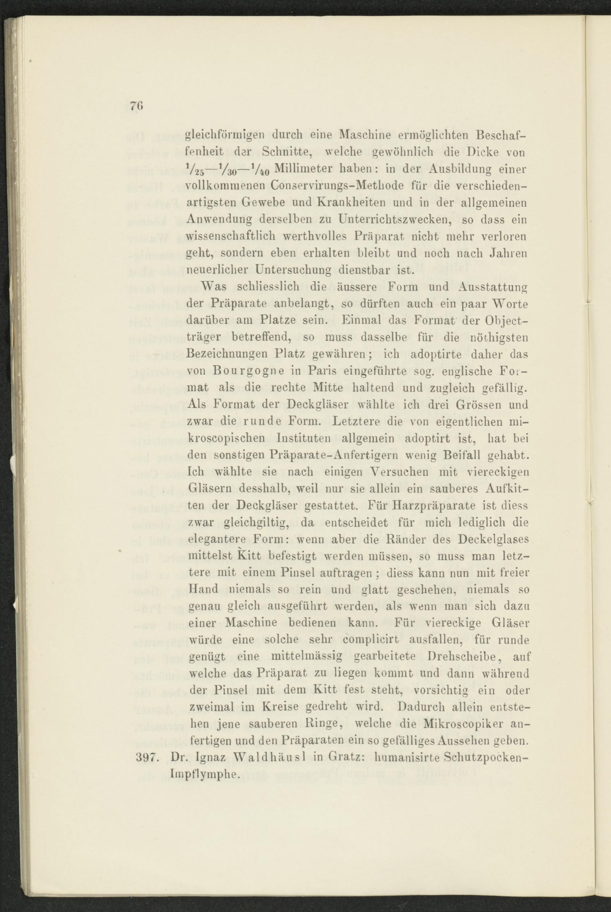 Was schliesslich die äussere Form und Ausstattung der Präparate anbelangt, so dürften auch ein paar Worte darüber am Platze sein. Einmal das Format der Object- träger betreffend, so muss dasselbe für die nötliigsten Bezeichnungen Platz gewähren; ich adoptirte daher das von Bourgogne in Paris eingeführte sog. englische Format als die rechte Mitte haltend und zugleich gefällig. Als Format der Deckgläser wählte ich drei Grössen und zwar die runde Form. Letztere die von eigentlichen mi- kroscopischen Instituten allgemein adoptirt ist, hat bei den sonstigen Präparate-Anfertigern wenig Beifall gehabt. Ich wählte sie nach einigen Versuchen mit viereckigen Gläsern desshalb, weil nur sie allein ein sauberes Aufkitten der Deckgläser gestattet. Für Harzpräparate ist diess zwar gleichgiltig, da entscheidet für mich lediglich die elegantere Form: wenn aber die Ränder des Deckelglases mittelst Kitt befestigt werden müssen, so muss man letztere mit einem Pinsel auftragen : diess kann nun mit freier Hand niemals so rein und glatt geschehen, niemals so genau gleich ausgeführt werden, als wenn man sich dazu einer Maschine bedienen kann. Für viereckige Gläser würde eine solche sehr complicirt ausfallen, für runde genügt eine mittelmässig gearbeitete Drehscheibe, auf welche das Präparat zu liegen kommt und dann während der Pinsel mit dem Kitt fest steht, vorsichtig ein oder zweimal im Kreise gedreht wird. Dadurch allein entstehen jene sauberen Ringe, welche die Mikroscopiker anfertigen und den Präparaten ein so gefälliges Aussehen gehen. Dr. Ignaz Waldhäusl in Gratz: humanisirte Schutzpockenimpflymphe.