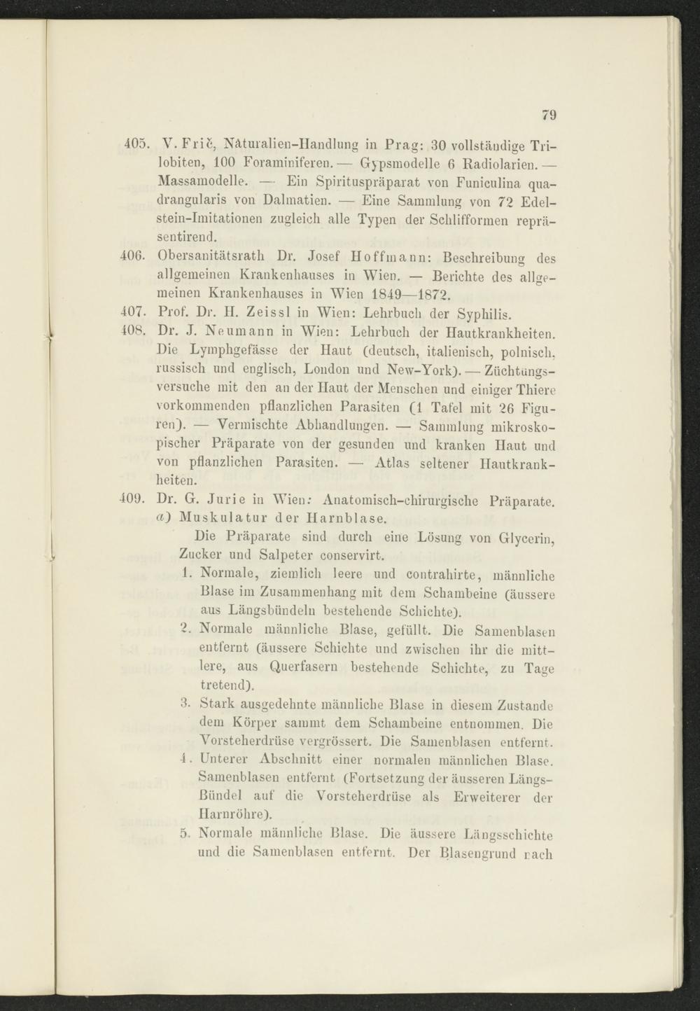 408. Dr. J. Neumann in Wien: Lehrbuch der Hautkrankheiten. Die Lymphgefässe der Haut (deutsch, italienisch, polnisch, russisch und englisch, London und New-York). — Züchtungsversuche mit den an der Haut der Menschen und einiger Thiere vorkommenden pflanzlichen Parasiten (1 Tafel mit 26 Figuren). — Vermischte Abhandlungen. — Sammlung mikroskopischer Präparate von der gesunden und kranken Haut und von pflanzlichen Parasiten. — Atlas seltener Hautkrankheiten.