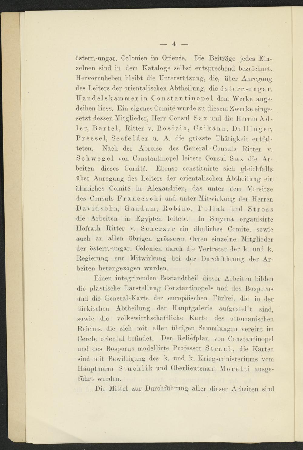 österr.-ungar. Colonien im Oriente. Die Beiträge jedes Einzelnen sind in dem Kataloge selbst entsprechend bezeichnet. Hervorzuheben bleibt die Unterstützung, die, über Anregung des Leiters der orientalischen Abtheilung, die österr.-ungar. Handelskammer in Constantinopel dem Werke angedeihen Hess. Ein eigenes Comité wurde zu diesem Zwecke eingesetzt dessen Mitglieder, Herr Consul Sax und die Herren Adler, Bartel, Ritter v. B o s i z i o, C z i k ä n n, Dollinger, Pressei, Seefelder u. A. die grösste Thätigkeit entfalteten. Nach der Abreise des General - Consuls Ritter v. Schwegel von Constantinopel leitete Consul Sax die Arbeiten dieses Comité. Ebenso constituirte sich gleichfalls iiher Anregung des Leiters der orientalischen Abtheilung ein ähnliches Comité in Alexandrien, das unter dem Vorsitze des Consuls Franceschi und unter Mitwirkung der Herren Davidsohn, Gaddum, Robino, Pollak und Stross die Arbeiten in Egypten leitete. In Smyrna organisirte Hofrath Ritter v. Scherz er ein ähnliches Comité, sowie auch an allen übrigen grösseren Orten einzelne Mitglieder der österr.-ungar. Colonien durch die Vertreter der k. und k. Regierung zur Mitwirkung bei der Durchführung der Arbeiten herangezogen wurden.